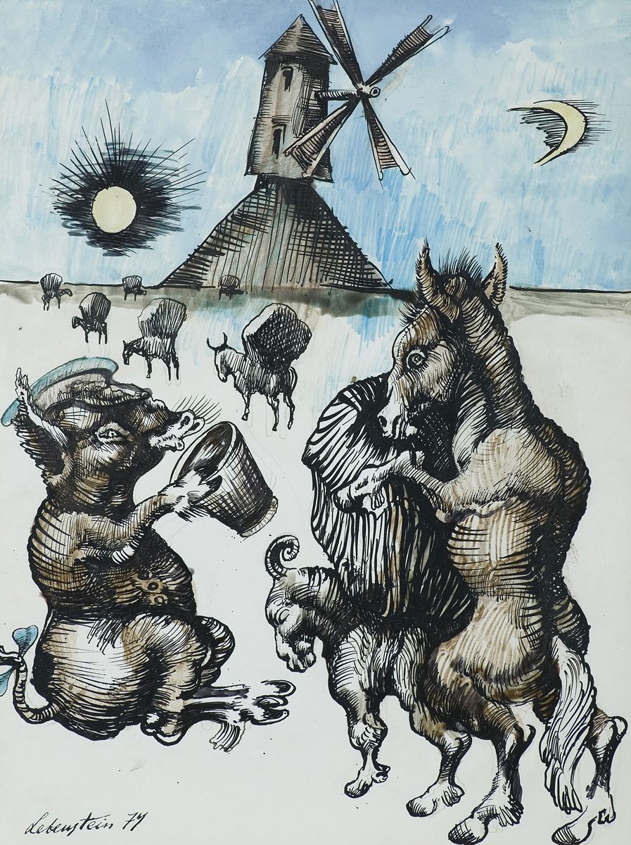 Jan Lebenstein (Brześć Litewski 1930 - Kraków 1999) w latach 1948-1954 studiował malarstwo w ASP w Warszawie pod kierunkiem prof. Eugeniusza Eibischa i Artura Nachta-Samborskiego. W 1955 wziął udział w wystawie w warszawskim Arsenale. Zaprzyjaźniony w czasie studiów z Mironem Białoszewskim, swą pierwszą wystawę indywidualną pokazał w 1956 w Teatrze na Tarczyńskiej. W 1959 zdobył Grand Prix de la Ville de Paris na I Biennale Młodych w Paryżu i w tym roku przeniósł się na stałe do Paryża. Po seriach "figur kreślonych" (na papierze milimetrowym) i "figur hieratycznych" z lat 1955-1958 maluje cykl "figur osiowych" (1958-1962), które wystawia w Paryżu i USA. Równolegle w 1960 zaczyna rysowane "karnety", rodzaj dziennika, który w przyszłości dostarczy motywów wykorzystanych w obrazach. W latach 1964-1965 maluje "Bestiarium", cykl fakturowych, archaizowanych stworów przypominających prehistoryczne wykopaliska. Bezpośrednio po nich wprowadza do swych obrazów postaci ludzkie i fantastyczne, odgrywające sceny ni to mitologiczne, ni to ze snu, często przesycone erotyką. W 1970 projektuje witraże dla Centre du Dialogue w Paryżu. W W 1971 otrzymuje obywatelstwo francuskie 1974 powstają gwasze inspirowane Folwarkiem zwierzęcym George'a Orwella. W latach 1976-1989 tworzy wyłącznie w technice gwaszu i pastelu, podejmując tematykę mitologiczną i zaczerpniętą z Biblii: cykle ilustracji do Księgi Hioba (wyd. 1979) i do Apokalipsy (wyd. 1986) w nowych przekładach Czesława Miłosza. W 1989 powraca do malarstwa olejnego (cykl "Pergamon"). Artysta otrzymał m. in. nagrodę Fundacji im. Alfreda Jurzykowskiego w 1976, Nagrodę Muzeum Archidiecezji Warszawskiej w 1985, Nagrodę im. Jana Cybisa w 1987.