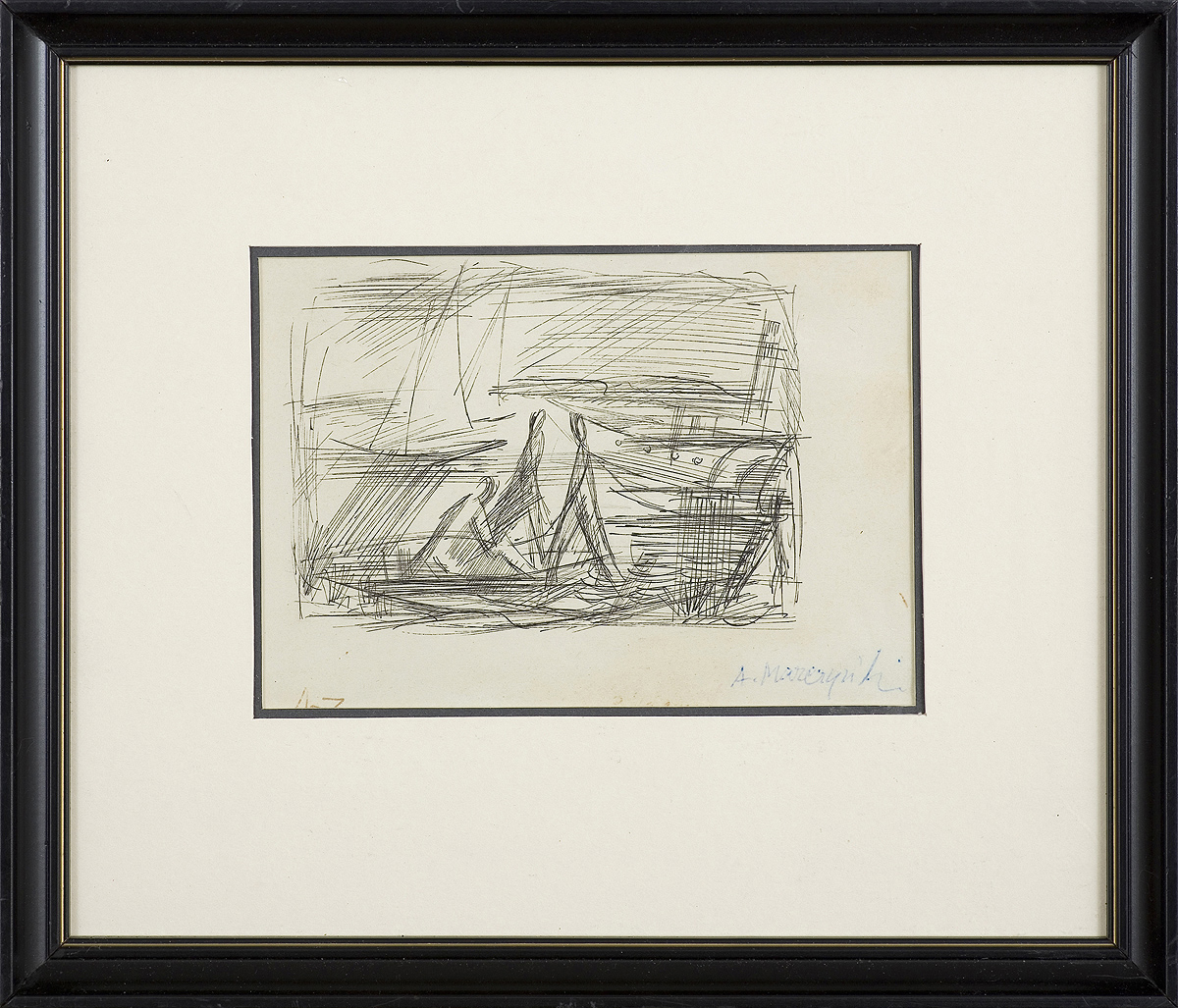 Adam Marczyński (Kraków 1908 – Kraków 1985) studiował malarstwo w ASP w Krakowie w latach 1930-1936 pod kierunkiem prof. Władysława Jarockiego i Stanisława Pieńkowskiego. Dyplom otrzymał w 1936. W czasie studiów odbył podróż do Francji i Hiszpanii (1930), po ich ukończeniu - do Francji (1936). W latach 1933-1934 był związany z „Grupą Krakowską“ (tzw. pierwszą), z którą dwukrotnie wystawiał. Wykonywał też scenografie dla teatru „Cricot“. Pierwsze lata II wojny światowej spędził we Lwowie. Wrócił do Krakowa w 1941. Po wojnie podjął pracę pedagogiczną w ASP (od 1945, profesor 1951, dziekan Wydziału Malarstwa 1970-1972, emerytowany w 1979). Jednocześnie na powrót stowarzyszył się z kręgiem artystów skupionych wokół Tadeusza Kantora i Marii Jaremy, którzy w 1957 powołali tzw. drugą „Grupę Krakowską“. Marczyński pozostawał jej członkiem i wystawiał z nią do końca życia. Zajmował się malarstwem, rysunkiem, scenografią, grafiką warsztatową i ilustracją książkową. Wykonywał też polichromie w kościołach. W latach 50. tworzył kubizujące kompozycje malarskie o jasnym kolorycie, sugerujące ni to pejzaże, ni to widoki podwodnych światów, odznaczające się poetyckim, surrealnym nastrojem, przywołującym na myśl sztukę Paula Klee i Joana Miró. Z wyrazem prac malarskich współgrały jego ówczesne rysunki, kreślone delikatną kreską. Od ok. 1960 wykonywał cykl obiektów pt. Konkrety, nawiązujących do malarstwa materii, w których wykorzystywał jako tworzywo płaty drewnianej sklejki lub forniru, papę, rzadziej blachę, poddawane dodatkowo różnym zabiegom, jak nadpalanie, niszczenie powierzchni itp. Od połowy lat 60. tworzył obiekty o elementach zmiennych - budowane z zestawianych dowolnie „pudełek“ o uchylnych wieczkach. Różne konfiguracje ich nachylenia powodowały zmienne rytmy całości kompozycji. Artysta wiele wystawiał, m.in. na Wystawie Olimpijskiej, Londyn 1948 (wyróżnienie i dyplom), Biennale Sztuki w Wenecji w 1956, II i III Wystawie Sztuki Nowoczesnej, Warszawa 1957 i 1959, II Międzynarodowym Biennale Grafiki, Lublana 1957 (nagroda honorowa), Biennale Sztuki w Sao Paulo 1959 i Documenta w Kassel 1959, Sympozjach „Złotego Grona“, Zielona Góra 1963 i 1965, I Biennale Form Przestrzennych, Elbląg 1965.