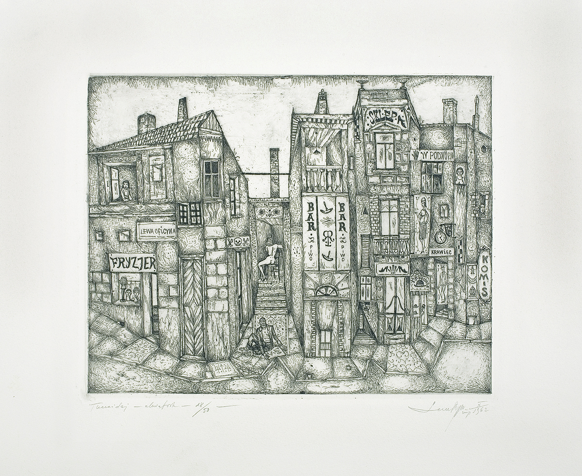 Leszek Rózga (Zgierz 1924 - Łódź 2015) - artysta grafik. W latach 1940-1945 przebywał na robotach w Niemczech, gdzie po zakończeniu wojny pracował w teatrze amatorskim i uczył się prywatnie malarstwa (1945-1947). Studiował w Państwowej Wyższej Szkole Sztuk Plastycznych w Łodzi (1948-1951) i na Wydziale Grafiki Propagandowej w Katowicach - filii ASP w Krakowie, gdzie obronił dyplom w 1954. W latach 1967-1994 był wykładowcą (od 1979 profesorem) w uczelni łódzkiej, gdzie stworzył szkołę metaforycznej, ekspresyjnej sztuki graficznej. Brał udział w licznych wystawach w kraju i za granicą, zdobywając często nagrody. Był również laureatem wielu nagród państwowych, resortowych, regionalnych itp., jak: Nagrody Ministra Kultury i Sztuki I st. 1981, 1986, 1994, Nagroda Woj. Łódzkiego 1972, Nagroda Miasta Łodzi 1985. Działał w ZPAP, był m. in. członkiem Rady Artystycznej Zarządu Głównego 1974-1976. Początkowo zajmował się głównie malarstwem, rysunkiem i monotypią, tworząc nastrojowe widoki miejskie. Od 1960 skupił się na grafice warsztatowej (głównie w technikach metalowych). W latach 70. wprowadzał do swych kompozycji werystycznie odwzorowane rośliny i owoce, inskrypcje, cytaty ze sztuki klasycznej.