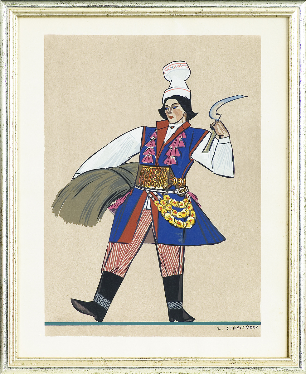 Zofia Stryjeńska, z domu Lubańska (Kraków 1891 - Genewa 1976) - malarka, ilustratorka, scenograf - była jedną z barwniejszych postaci polskiego środowiska artystycznego w dwudziestoleciu międzywojennym. Po krótkim okresie nauki u Leonarda Stroynowskiego i w krakowskiej szkole Marii Niedzielskiej wyjechała do Monachium, gdzie w latach 1911-1912 w męskim przebraniu studiowała w Akademii Sztuk Pięknych (kobiet wówczas na studia nie przyjmowano). Debiutowała w krakowskim TPSP w roku 1912 cyklem kartonów Polskich bajd inspirowanych opowieściami ludowymi. W 1916 wyszła za mąż za Karola Stryjeńskiego. Do 1919 mieszkała w Krakowie, później w Paryżu, Krakowie, Zakopanem i Warszawie. W roku 1925 odniosła międzynarodowy sukces na Wystawie Sztuki Dekoracyjnej w Paryżu, otrzymując Gran Prix w czterech działach (malarstwo, plakat, tkanina, ilustracja) oraz Diplom d’Honneur za projekty zabawek. Zajmowała się dekoracyjnym malarstwem architektonicznym, polichromią, ilustratorstwem, scenografią (m.in. Harnasie Karola Szymanowskiego; 1938), wzornictwem przemysłowym (projekty kilimów, zabawek). Stworzyła własny specyficzny styl w dekoracyjnie stylizowanych, barwnych, pełnych dynamiki i temperamentu obrazach; temperach, akwarelach i gwaszach. W ich tematyce odwoływała się do legend, wierzeń, historii i obyczajowości ludowej. Wydała kilka tek graficznych (Bożki słowiańskie, 1917 i 1922) i albumów reprodukcji (Tańce polskie, 1927; Pascha, 1929; Piastowie, 1929; Gusła Słowian / Magie Slave, 1934). Jej prace popularyzowane były także przez liczne barwne pocztówki.