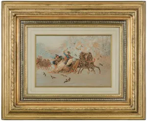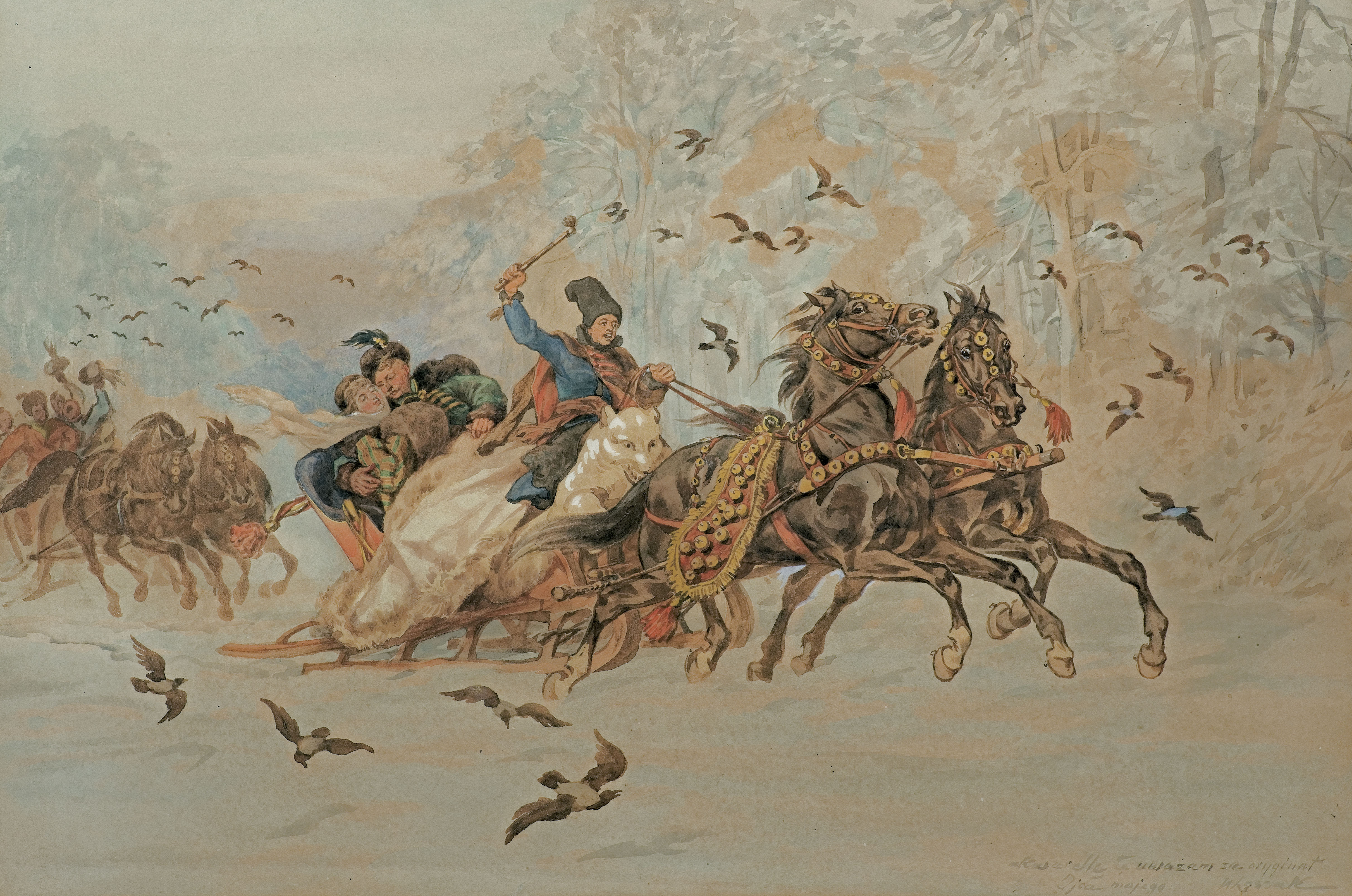 Juliusz Kossak (Wiśnicz 1824 - Kraków 1899) - malarz i ilustrator - był jednym z najpopularniejszych artystów polskich 2. połowy XIX wieku. Naukę rysunku i malarstwa rozpoczął we lwowskiej pracowni Jana Maszkowskiego; później wiele rysował z natury odwiedzając majątki szlacheckie na Ukrainie, Podolu i Wołyniu. W roku 1852 był w Wiedniu, na Węgrzech i w Petersburgu, a następnie zamieszkał na stałe w Warszawie. Lata 1856-1860 spędził w Paryżu, gdzie przyjaźnił się z Horacem Vernetem. Powróciwszy do Warszawy w latach 1862-1868 był kierownikiem artystycznym „Tygodnika Ilustrowanego”. W roku 1869 przeniósł się na stałe do Krakowa, skąd wyjeżdżał jeszcze do Monachium, by malować w atelier batalisty Franza Adama. Kossak był przede wszystkim znakomitym akwarelistą; rzadziej posługiwał się techniką olejną. Malował obrazy historyczne i batalistyczne, sceny rodzajowe ilustrujące życie i tradycje dworu szlacheckiego oraz obyczaje polskiego ludu. Ale prawdziwymi bohaterami jego obrazów były konie, których ruch, temperament, charakter i indywidualność potrafił po mistrzowsku przedstawić. Był także autorem wielu ilustracji do czasopism i książek, trafiającym bezbłędnie tak w klimat utworów literackich, jak i w tęsknoty i potrzeby odbiorców - czytelników Pieśni o ziemi naszej Wincentego Pola, Trylogii Henryka Sienkiewicza, Pana Tadeusza i poematów Adama Mickiewicza.
