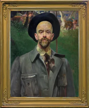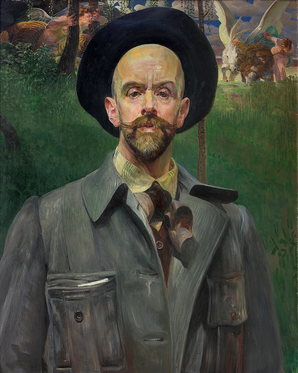 Obraz - autoportret artysty na tle zieleni - powstał w roku 1908. Malczewski mieszkał wówczas w willi„Pod Matką Boską” na krakowskim Zwierzyńcu (dzis ul. Księcia Józefa 29). Dom otoczony był dużym ogrodem, który wznosił się tarasami po stoku wzgórza. Ten bliski, przydomowy pejzaż - powtarzający się także w innych autoportretach z tego okresu - artysta uczynił tłem swego portretu, portretu w zwyczajnym roboczym stroju, jakiego zwykł używać przy pracy (szara bluza i kapelusz).