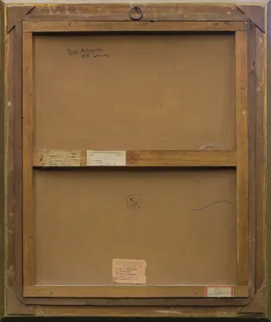 Na odwrocie, w dolnej partii tektury stemple paryskiej firmy Lefranc & Cie oferującej farby i różne inne materiały malarskie (kartusz z kaduceuszem i kotwicą pomiędzy literami L i F); przy dolnej krawędzi stempel 25. U góry i w partii dolnej - dwa stemple o treści: DR LEOPOLD MACHARSKI | KRAKÓW | Rynek gł. – Pałac Spiski. Przy „górnym” stemplu dopisane atramentem słowo: Własność. Na górnej listwie krosna napis ołówkiem: /../ Macharski; obok czerwoną kredką: 14.