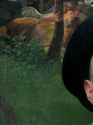Uwaga malarza, a także odbiorcy dzieła, skupia się przede wszystkim na twarzy modela, samego artysty zamyślonego i niejako zapatrzonegowe własne myśli. Postaci w tle na dalekim planie są dopełnieniem tresci obrazu, przywodząc rozmaite wątki z twórczości Malczewskiego - żywiołu natury, cielesności, ułudy, kaprysu (Chimera), natchnienia, poezji (Pegaz, Muza) oraz cierpień, walki i tęsknoty za wolną Ojczyzną (wędrowiec w szynelu, Sybirak).