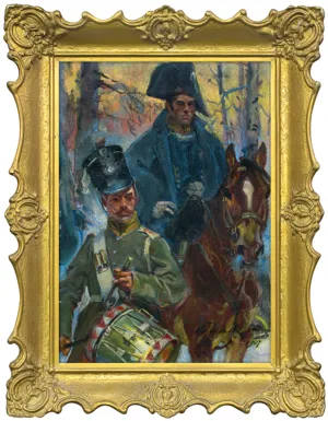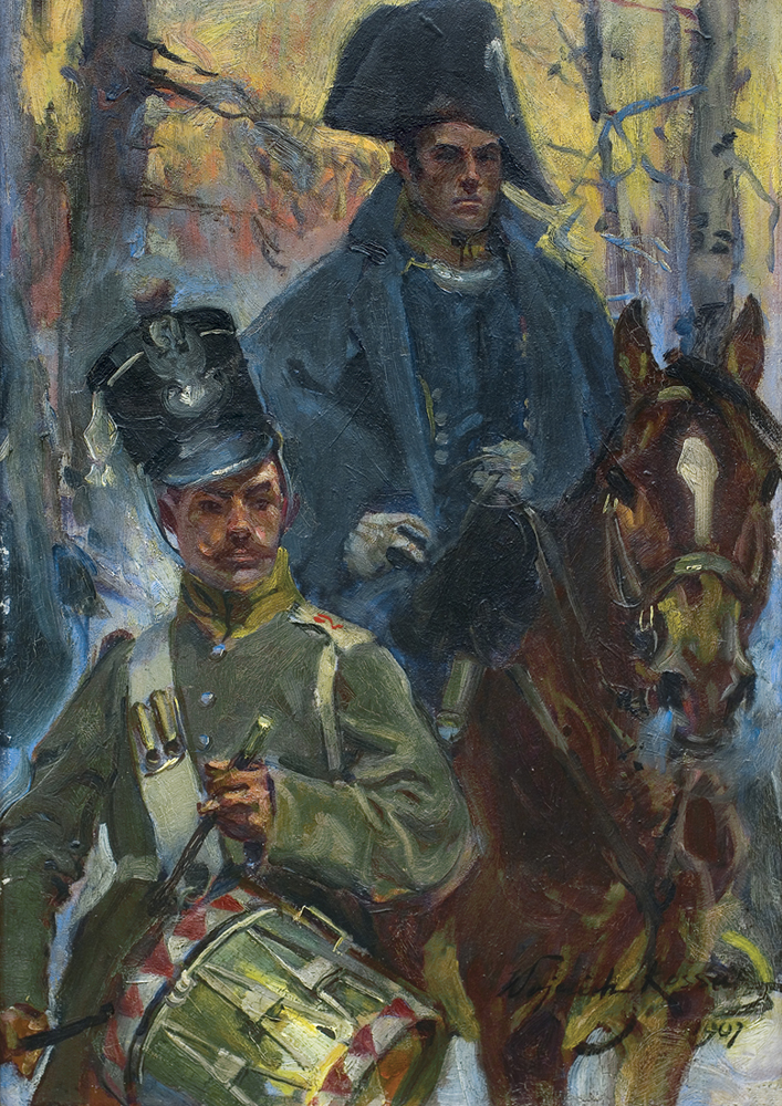 Wojciech Kossak (Paryż 1856 - Kraków 1942 ) – powszechnie znany malarz, postrzegany przede wszystkim jako świetny batalista. Syn i uczeń Juliusza Kossaka kształcił się w krakowskiej Szkole Sztuk Pięknych, w Akademii monachijskiej oraz w Paryżu. W latach 1895-1902 przebywał głównie w Berlinie, pracując dla cesarza Wilhelma II. Wiele podróżował, m.in. do Hiszpanii i Egiptu, gdzie wykonywał szkice do zamierzonych panoram. W późniejszych latach kilkakrotnie wyjeżdżał do Stanów Zjednoczonych wykonując zamówienia portretowe. W 1913 był mianowany profesorem warszawskiej Szkoły Sztuk Pięknych. W latach I wojny światowej pełnił służbę wojskową. Był współautorem panoram: „Racławice” (1893-1894), „Berezyna” (1895-1896), „Bitwa pod piramidami” (1901) oraz szkiców do niezrealizowanej „Somosierry” (1900). Z temperamentem i swobodą tworzył szeroko malowane, dynamiczne sceny batalistyczne, historyczne, rodzajowe oraz liczne portrety. Z upodobaniem malował konie. Jego obrazy, gloryfikujące dawne i współczesne artyście polskie wojsko i bohaterstwo żołnierzy, trafiały do patriotycznych uczuć odbiorców i cieszyły się ogromna popularnością.