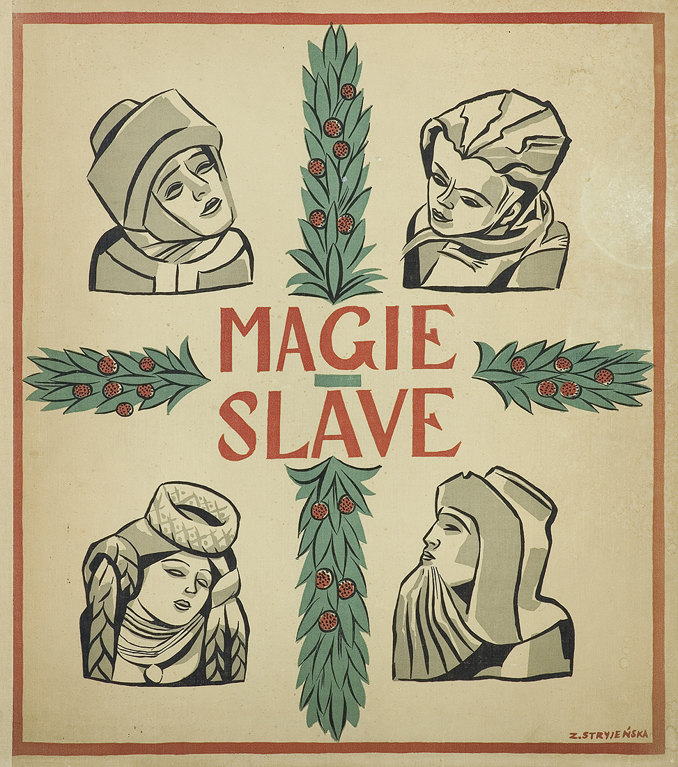 Zofia Stryjeńska, z domu Lubańska (Kraków 1891 - Genewa 1976) - malarka, ilustratorka, scenograf - była jedną z barwniejszych postaci polskiego środowiska artystycznego w dwudziestoleciu międzywojennym. Po krótkim okresie nauki u Leonarda Stroynowskiego i w krakowskiej szkole Marii Niedzielskiej wyjechała do Monachium, gdzie w latach 1911-1912 w męskim przebraniu studiowała w Akademii Sztuk Pięknych (kobiet wówczas na studia nie przyjmowano). Debiutowała w krakowskim TPSP w roku 1912 cyklem kartonów Polskich bajd inspirowanych opowieściami ludowymi. W 1916 wyszła za mąż za Karola Stryjeńskiego. Do 1919 mieszkała w Krakowie, później w Paryżu, Krakowie, Zakopanem i Warszawie. W roku 1925 odniosła międzynarodowy sukces na Wystawie Sztuki Dekoracyjnej w Paryżu, otrzymując Gran Prix w czterech działach (malarstwo, plakat, tkanina, ilustracja) oraz Diplom d’Honneur za projekty zabawek. Zajmowała się dekoracyjnym malarstwem architektonicznym, polichromią, ilustratorstwem, scenografią (m.in. Harnasie Karola Szymanowskiego; 1938), wzornictwem przemysłowym (projekty kilimów, zabawek). Stworzyła własny specyficzny styl w dekoracyjnie stylizowanych, barwnych, pełnych dynamiki i temperamentu obrazach; temperach, akwarelach i gwaszach. W ich tematyce odwoływała się do legend, wierzeń, historii i obyczajowości ludowej. Wydała kilka tek graficznych (Bożki słowiańskie, 1917 i 1922) i albumów reprodukcji (Tańce polskie, 1927; Pascha, 1929; Piastowie, 1929; Gusła Słowian / Magie Slave, 1934). Jej prace popularyzowane były także przez liczne barwne pocztówki.