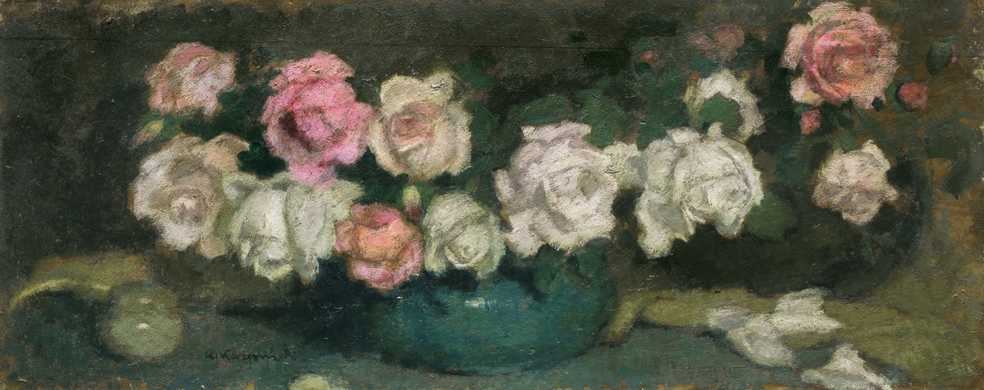 Alfons Karpiński (Rozwadów, dziś dzielnica Stalowej Woli 1875 - Kraków 1961) w latach 1891-1899 studiował w krakowskiej Szkole Sztuk Pięknych pod kierunkiem Floriana Cynka, Izydora Jabłońskiego, Władysława Łuszczkiewicza i Leona Wyczółkowskiego, a następnie kształcił się jeszcze u Antona Ažbégo w Monachium (1903), u Kazimierza Pochwalskiego w Wiedniu, a od 1907 także w Paryżu. Podróżował do Włoch i Londynu. Stale mieszkał w Krakowie; związany z tamtejszym środowiskiem skupionym wokół „Zielonego Balonika” projektował dekoracje do przedstawień kabaretu. Należał do Tow. Artystów Polskich „Sztuka”, grupy „Zero”, był członkiem wiedeńskiego stowarzyszenia „Secesja” i krakowskiego TPSP. Uczestniczył w wielu wystawach w kraju i za granicą. W czasie I wojny światowej służył w armii austriackiej. Na bogatą twórczość artysty składają się wczesne sceny rodzajowe z podkrakowskiej wsi, pejzaże i portrety, wśród nich zwłaszcza portrety kobiece, które przyniosły mu szczególną popularność. Z czasem głównym – obok portretu – tematem jego obrazów stały się martwe natury z kwiatami, dekoracyjne kompozycje o stonowanej gamie barwnej. Artysta zajmował się także grafiką i ilustratorstwem.