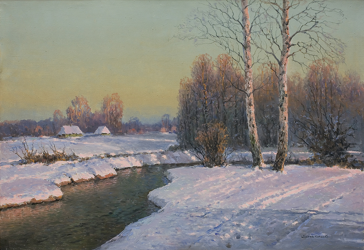 Wiktor Korecki (Kamieniec Podolski 1890 - Komorów k. Warszawy 1980) - malarz pejzażysta - gimnazjum ukończył w Kijowie, tam też studiował w Szkole Rysunkowej Aleksandra Muraszki. Po studiach wrócił do Kamieńca Podolskiego, skąd w roku 1921 wyjechał do Warszawy. Tu miał pracownię na rogu ulic Tamki i Cichej. Niestety zgromadzone tam obrazy spłonęły w czasie powstania 1944 roku. Po powstaniu artysta przebywał w obozie w Pruszkowie skąd trafił do obozu pracy w Lipsku. Do kraju powrócił w roku 1946 i zamieszkał w Komorowie pod Warszawą, a później w Milanówku. Jego nastrojowe krajobrazy emanujące spokojem i pogodą cieszyły się zawsze dużą popularnością. Korecki najczęściej malował pejzaże zimowe z motywem leśnej drogi i strumienia wijącego się wśród śniegów, a obok nich także wiosenne, letnie czy jesienne widoki z Mazowsza.