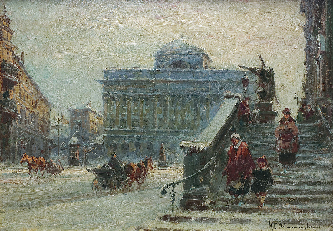 Władysław Chmieliński (Warszawa 1911 - Warszawa 1979) był malarzem związanym z Warszawą, gdzie stale mieszkał i pracował. W latach 1926-1931 studiował w warszawskiej Miejskiej Szkole Sztuk Zdobniczych i Malarstwa (dawna Klasa Rysunkowa). Wiodącym tematem jego obrazów były widoki miejskie, malowane olejno i akwarelą. W latach 1935-1938 stworzył cykl akwarel przedstawiających obiekty polskiej architektury; wśród nich, widoki Sandomierza, Krakowa, Kazimierza nad Wisłą, a także wnętrza zabytkowych kościołów czy pałaców, m.in. Zamku Królewskiego w Warszawie i Pałacu w Wilanowie. Malował także pejzaże i wiejskie sceny rodzajowe – kuligi, sanny, zaprzęgi, wesela, konie na tle krajobrazu. W latach 1967-1969 wyjeżdżał na dłuższe pobyty do Danii. W latach 1936-1939 artysta używał także pseudonimu „Władysław Stachowicz”.