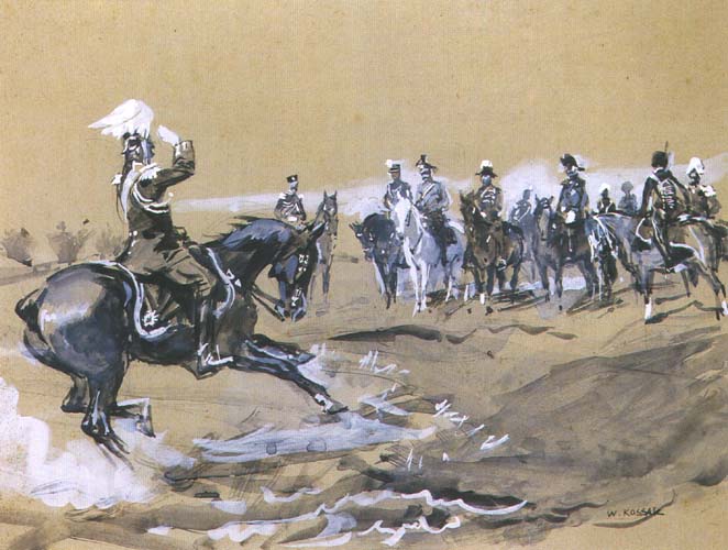 Wojciech Kossak (Paryż 1856 - Kraków 1942 ) – powszechnie znany malarz, postrzegany przede wszystkim jako świetny batalista. Syn i uczeń Juliusza Kossaka kształcił się w krakowskiej Szkole Sztuk Pięknych, w Akademii monachijskiej oraz w Paryżu. W latach 1895-1902 przebywał głównie w Berlinie, pracując dla cesarza Wilhelma II. Wiele podróżował, m.in. do Hiszpanii i Egiptu, gdzie wykonywał szkice do zamierzonych panoram. W późniejszych latach kilkakrotnie wyjeżdżał do Stanów Zjednoczonych wykonując zamówienia portretowe. W 1913 był mianowany profesorem warszawskiej Szkoły Sztuk Pięknych. W latach I wojny światowej pełnił służbę wojskową. Był współautorem panoram: „Racławice” (1893-1894), „Berezyna” (1895-1896), „Bitwa pod piramidami” (1901) oraz szkiców do niezrealizowanej „Somosierry” (1900). Z temperamentem i swobodą tworzył szeroko malowane, dynamiczne sceny batalistyczne, historyczne, rodzajowe oraz liczne portrety. Z upodobaniem malował konie. Jego obrazy, gloryfikujące dawne i współczesne artyście polskie wojsko i bohaterstwo żołnierzy, trafiały do patriotycznych uczuć odbiorców i cieszyły się ogromna popularnością.