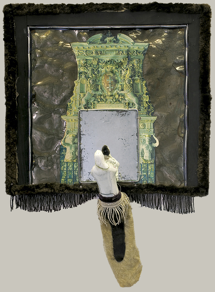 tkanina, lusterko, figurka porcelanowa, staniol, papier, blacha, frędzle do kotar, sklejka