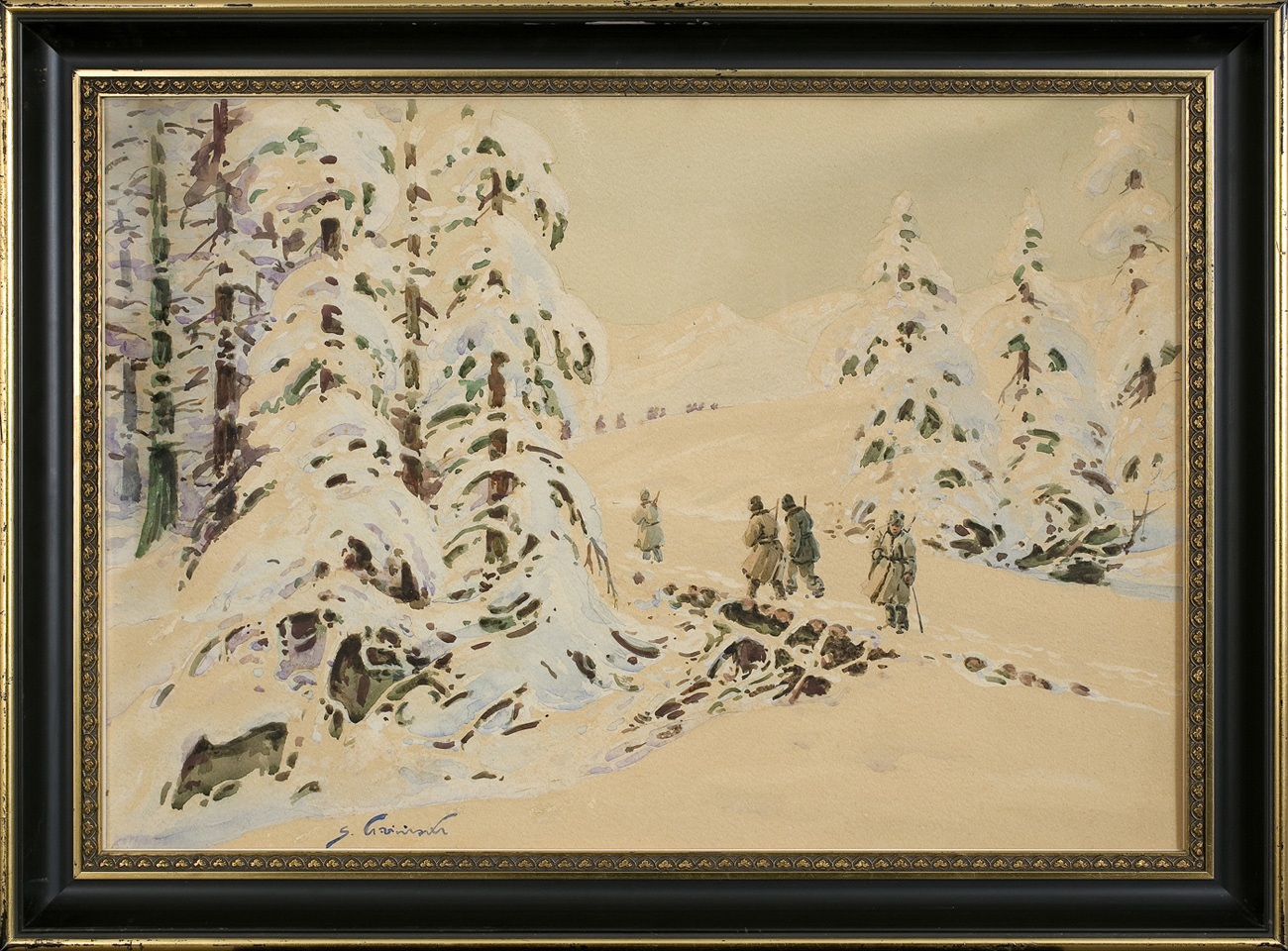 Stanisław Gibiński (Rzeszów 1882 – Katowice 1971) od wczesnej młodości pracował na kolei, początkowo w Rzeszowie, następnie w Krakowie, gdzie równocześnie mógł podjąć naukę w Akademii Sztuk Pięknych, prawdopodobnie jako wolny słuchacz. W czasie I wojny światowej służył w II Brygadzie Legionów dowodzonej przez J. Hallera i odbył kampanię w Karpatach, walcząc pod Rafajłową, Mołodecznem, Przełęczą Pantyrską. Po wojnie nadal pracował na kolei, łącząc pracę zawodową z twórczością plastyczną. Był malarzem akwarelistą; malował pejzaże, wiejskie sceny rodzajowe, rybaków czy polowania, które najczęściej przedstawiał w śnieżnym, zimowym pejzażu. Sam często uczestniczył w polowaniach i ten temat znał doskonale. Malował też moczary, rozlewiska, krajobrazy jesienne. W jego malarstwie wyraźnie widoczne są inspiracje sztuką Fałata, ale też Wyczółkowskiego i malarzy krakowskiej szkoły pejzażu. Artysta wielokrotnie uczestniczył w wystawach krakowskiego TPSP, a po 1926 także w wystawach „Niezależnych“. Wystawiał też i w innych miastach, a jego sztuka cieszyła się znacznym powodzeniem