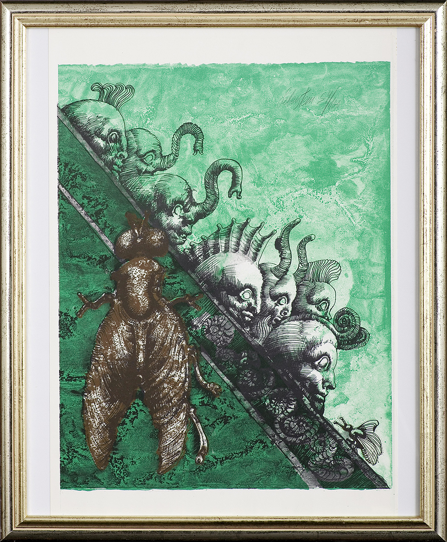 Jan Lebenstein (Brześć Litewski 1930 - Kraków 1999) w latach 1948-1954 studiował malarstwo w ASP w Warszawie pod kierunkiem prof. Eugeniusza Eibischa i Artura Nachta-Samborskiego. W 1955 wziął udział w wystawie w warszawskim Arsenale. Zaprzyjaźniony w czasie studiów z Mironem Białoszewskim, swą pierwszą wystawę indywidualną pokazał w 1956 w Teatrze na Tarczyńskiej. W 1959 zdobył Grand Prix de la Ville de Paris na I Biennale Młodych w Paryżu i w tym roku przeniósł się na stałe do Paryża. Po seriach "figur kreślonych" (na papierze milimetrowym) i "figur hieratycznych" z lat 1955-1958 maluje cykl "figur osiowych" (1958-1962), które wystawia w Paryżu i USA. Równolegle w 1960 zaczyna rysowane "karnety", rodzaj dziennika, który w przyszłości dostarczy motywów wykorzystanych w obrazach. W latach 1964-1965 maluje "Bestiarium", cykl fakturowych, archaizowanych stworów przypominających prehistoryczne wykopaliska. Bezpośrednio po nich wprowadza do swych obrazów postaci ludzkie i fantastyczne, odgrywające sceny ni to mitologiczne, ni to ze snu, często przesycone erotyką. W 1970 projektuje witraże dla Centre du Dialogue w Paryżu. W W 1971 otrzymuje obywatelstwo francuskie 1974 powstają gwasze inspirowane Folwarkiem zwierzęcym George'a Orwella. W latach 1976-1989 tworzy wyłącznie w technice gwaszu i pastelu, podejmując tematykę mitologiczną i zaczerpniętą z Biblii: cykle ilustracji do Księgi Hioba (wyd. 1979) i do Apokalipsy (wyd. 1986) w nowych przekładach Czesława Miłosza. W 1989 powraca do malarstwa olejnego (cykl "Pergamon"). Artysta otrzymał m. in. nagrodę Fundacji im. Alfreda Jurzykowskiego w 1976, Nagrodę Muzeum Archidiecezji Warszawskiej w 1985, Nagrodę im. Jana Cybisa w 1987.