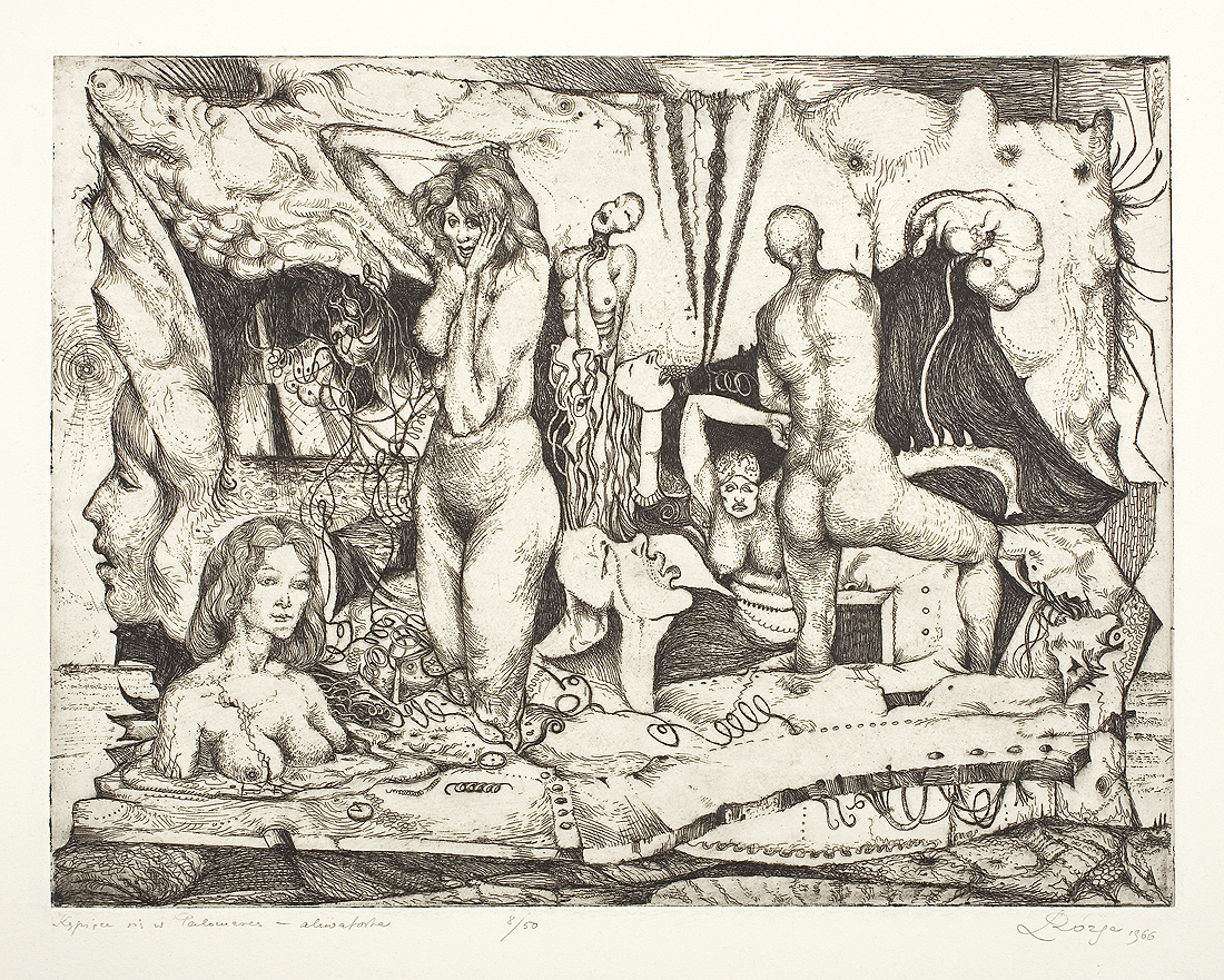 Leszek Rózga (Zgierz 1924 - Łódź 2015) - artysta grafik. W latach 1940-1945 przebywał na robotach w Niemczech, gdzie po zakończeniu wojny pracował w teatrze amatorskim i uczył się prywatnie malarstwa (1945-1947). Studiował w Państwowej Wyższej Szkole Sztuk Plastycznych w Łodzi (1948-1951) i na Wydziale Grafiki Propagandowej w Katowicach - filii ASP w Krakowie, gdzie obronił dyplom w 1954. W latach 1967-1994 był wykładowcą (od 1979 profesorem) w uczelni łódzkiej, gdzie stworzył szkołę metaforycznej, ekspresyjnej sztuki graficznej. Brał udział w licznych wystawach w kraju i za granicą, zdobywając często nagrody. Był również laureatem wielu nagród państwowych, resortowych, regionalnych itp., jak: Nagrody Ministra Kultury i Sztuki I st. 1981, 1986, 1994, Nagroda Woj. Łódzkiego 1972, Nagroda Miasta Łodzi 1985. Działał w ZPAP, był m. in. członkiem Rady Artystycznej Zarządu Głównego 1974-1976. Początkowo zajmował się głównie malarstwem, rysunkiem i monotypią, tworząc nastrojowe widoki miejskie. Od 1960 skupił się na grafice warsztatowej (głównie w technikach metalowych). W latach 70. wprowadzał do swych kompozycji werystycznie odwzorowane rośliny i owoce, inskrypcje, cytaty ze sztuki klasycznej.