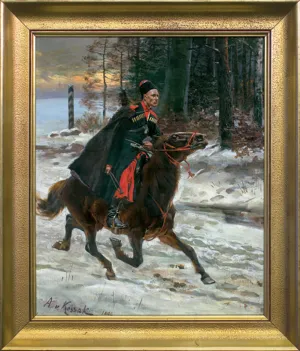Wojciech Kossak (Paryż 1856 - Kraków 1942 ) – powszechnie znany malarz, postrzegany przede wszystkim jako świetny batalista. Syn i uczeń Juliusza Kossaka kształcił się w krakowskiej Szkole Sztuk Pięknych, w Akademii monachijskiej oraz w Paryżu. W latach 1895-1902 przebywał głównie w Berlinie, pracując dla cesarza Wilhelma II. Wiele podróżował, m.in. do Hiszpanii i Egiptu, gdzie wykonywał szkice do zamierzonych panoram. W późniejszych latach kilkakrotnie wyjeżdżał do Stanów Zjednoczonych wykonując zamówienia portretowe. W 1913 był mianowany profesorem warszawskiej Szkoły Sztuk Pięknych. W latach I wojny światowej pełnił służbę wojskową. Był współautorem panoram: „Racławice” (1893-1894), „Berezyna” (1895-1896), „Bitwa pod piramidami” (1901) oraz szkiców do niezrealizowanej „Somosierry” (1900). Z temperamentem i swobodą tworzył szeroko malowane, dynamiczne sceny batalistyczne, historyczne, rodzajowe oraz liczne portrety. Z upodobaniem malował konie. Jego obrazy, gloryfikujące dawne i współczesne artyście polskie wojsko i bohaterstwo żołnierzy, trafiały do patriotycznych uczuć odbiorców i cieszyły się ogromna popularnością.