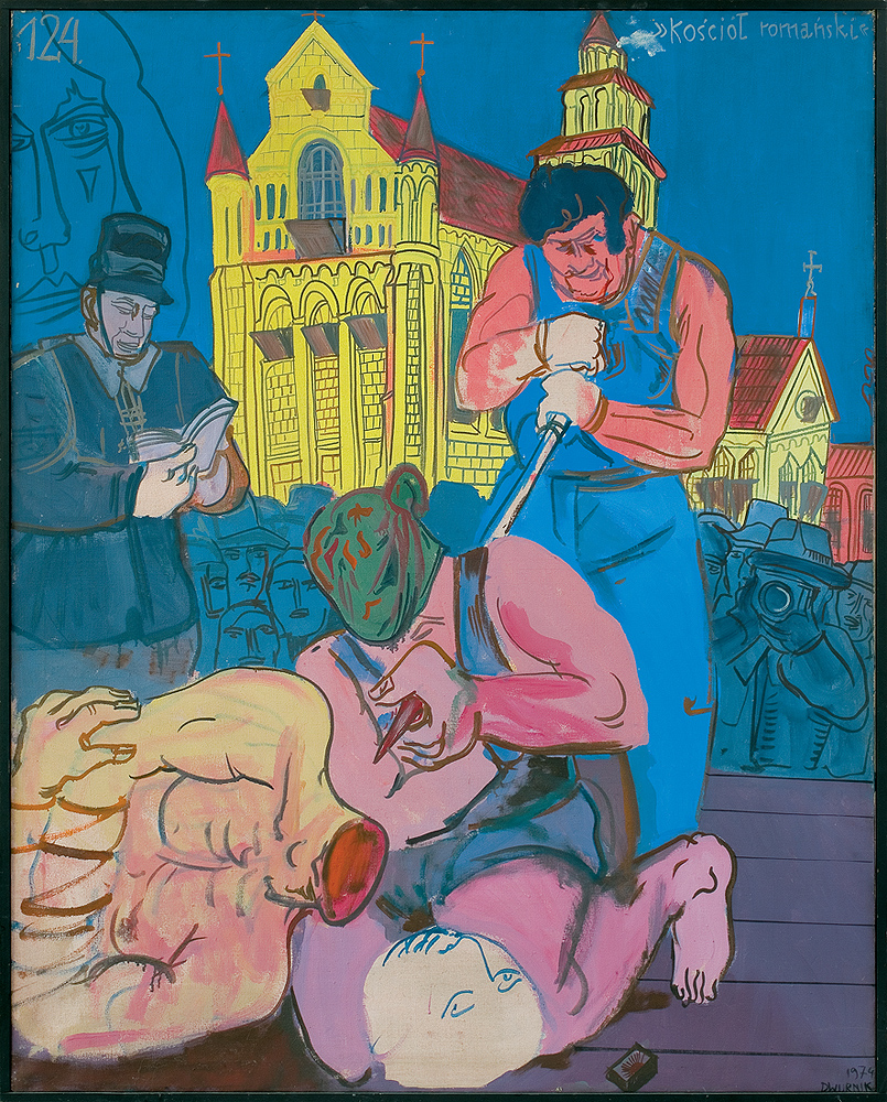 Edward Dwurnik (Radzymin 19 IV 1943 - Warszawa 28 X 2018) studiował malarstwo w ASP w Warszawie (1963-1970), jednak jako swego „mistrza“ wymienia Nikifora. Jego to prace, zobaczone po raz pierwszy w 1965, zainspirowały ówczesnego studenta III roku do narysowania pierwszych prac z cyklu „Podróże autostopem“, które kontynuował w nastepnych latach. W 1972-1978 powstawał cykl „Sportowcy“, w którym portretowane były, dodajmy - kąśliwie, typowe postaci z lat 70. Równolegle od 1975 powstawał cykl „Robotnicy“, który kulminował w okresie „Solidarności“ 1980-1981. Za prace z tego cyklu Dwurnik otrzymał w 1981 Nagrodę Krytyki Artystycznej im. Cypriana Kamila Norwida, natomiast za obrazy z cyklu „Warszawa“ (1981), proroczo zapowiadające stan wojenny - Nagrodę Kulturalną „Solidarności“ podziemnej w 1983. W latach 80. malarstwo Dwurnika przybrało wyraz ekspresyjny i dramatyczny. Powstające w tej dekadzie obrazy miały niejednokrotnie wymowę polityczną, przybierały też kostium historyczny, tak czy inaczej odnoszący się do współczesnych spraw i realiów. Cykl „Droga na Wschód“ (1989-91) upamiętniał ofiary stalinizmu, natomiast cykl „Od Grudnia do Czerwca“ (1990-94) - ofiary stanu wojennego. Zarówno ideowe, jak i czysto malarskie walory tych prac przyniosły artyście ogromne uznanie, zarówno w kraju jak i za granicą. Jego wyrazem była prestiżowa nagroda Fundacji Coutts & Co w Zurychu (1992). W latach 90. powstają cykle będące kontynuacją „Podróży autostopem“: „Niebieskie miasta“ (od 1993) i „Diagonale“ (od 1996), jak również kompozycje nowego typu, jak widoki morskie (cykl „Błękitne“, 1992-93) czy cykl „Wyliczanka“ (1996-99). Artysta wiele wystawia, miał ok. 100 wystaw indywidualnych w Polsce i za granicą, brał też udział w licznych wystawach i festiwalach krajowych i międzynarodowych, m.in.: X Biennale Sztuki Współczesnej, Menton 1974, Documenta 7, Kassel 1982, 5th Biennale, Sydney 1985, XIX Biennale Sztuki, Sao Paulo 1987; Olimpiada Sztuki, Seul 1988. Równolegle z malarstwem uprawiał rysunek, collage, grafikę warsztatową (litografia, techniki metalowe, kserografia, stemple) i użytkową (ilustracja, plakaty do własnych wystaw indywidualnych).