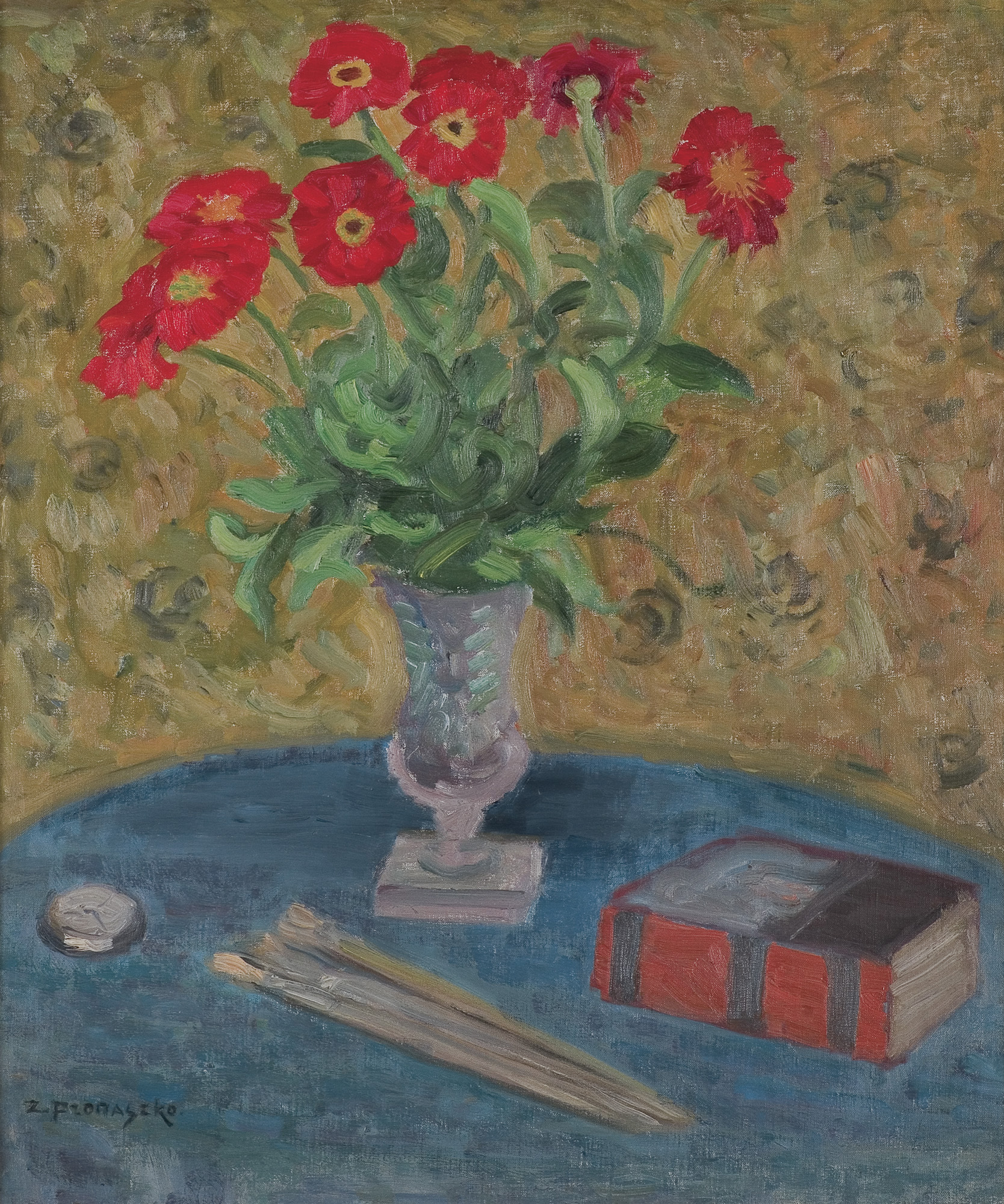 Zbigniew Pronaszko (Derebczyn k. Jampola (Żychlin na Podolu ?) 1885 - Kraków 1958) - malarz, grafik, rzeźbiarz i scenograf - studia artystyczne rozpoczął w Kijowie, skąd niebawem przeniósł się do Krakowa, by w latach 1906-1911 kształcić się w tamtejszej Akademii Sztuk Pięknych u Teodora Axentowicza i Jacka Malczewskiego. W czasie studiów podróżował do Wiednia, Monachium, Florencji i Paryża. Lata pierwszej wojny światowej spędził w Zakopanem. W 1917 był współzałożycielem grupy Ekspresjonistów Polskich (w 1919 przemianowanej na Formistów). Po wojnie w latach 1923-1925 wykładał na Wydziale Sztuk Pięknych Uniwersytetu Stefana Batorego w Wilnie. Następnie mieszkał w Krakowie, nauczając w Wolnej Szkole Malarstwa L. Mehofferowej, a od 1945 także w Akademii Sztuk Pięknych. Malował krajobrazy, martwe natury, kompozycje figuralne i portrety. We wczesnym okresie twórczości, pod wpływem Jacka Malczewskiego tworzył kompozycje symbolistyczne, jak znane z tytułów w katalogach Brzemię, Pan, Złoty cielec, Bajka o śmierci (Muzeum Narodowe w Warszawie) czy Wspomnienie i Portret matki (Muzeum Narodowe w Krakowie). W późniejszym, formistycznym okresie inspiracje czerpał z malarstwa Cezane’a, kubizmu i polskiej sztuki ludowej. Około 1925 zainteresował się koloryzmem. Obok malarstwa sztalugowego zajmował się scenografią, rzeźbą (pomnik A. Mickiewicza w Wilnie, 1922-24) i malarstwem ściennym (plafony wawelskie, 1933-1934). Był znakomitym karykaturzystą, a także ilustratorem. Wystawiał od 1907; m.in. w Krakowie, we Lwowie, w Warszawie, Poznaniu a także w Pittsburghu (1931), Wenecji (1932), w Paryżu (1922, 1928, 1937) i Wiedniu (1928), Brukseli (1935). Był członkiem Towarzystwa. Artystów polskich „Sztuka” i brał udział w jego wystawach. Wystawiał też z grupami „Zero” (1909), „Nowa Generacja” (1932), należał do grupy „Zwornik”.