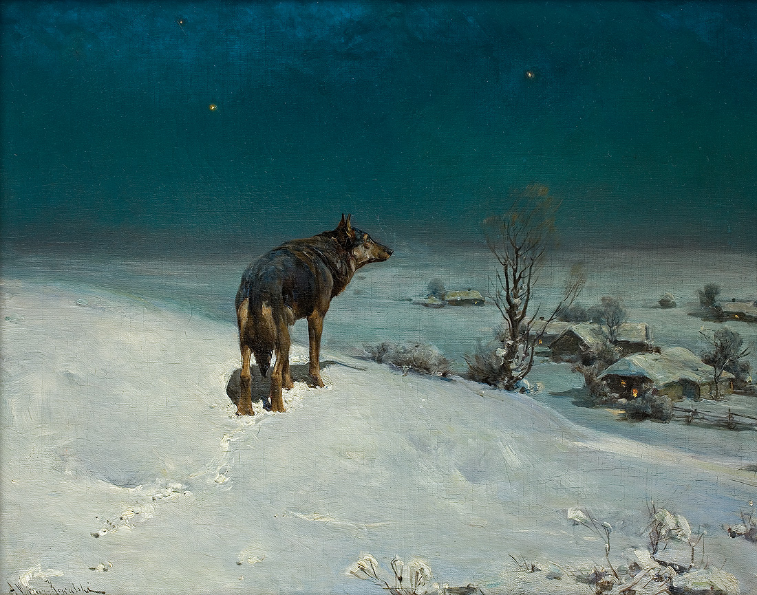Alfred Wierusz-Kowalski (Suwałki 1849 – Monachium 1915) - jeden z najwybitniejszych polskich malarzy tzw. szkoły monachijskiej był, obok Józefa Brandta i Władysława Czachórskiego, także najpopularniejszym z polskich artystów osiadłych i stale działających w Monachium. Zamieszkał tam w roku 1873, już po studiach w Warszawie i w Dreźnie. Przez rok uczył się jeszcze w monachijskiej Akademii Sztuk Pięknych pod kierunkiem Alexandra Wagnera, a następnie przeniósł się do prywatnej pracowni Brandta. Uznanie krytyki i publiczności zdobył wcześnie; jego obrazy, odznaczane medalami na wystawach były rozchwytywane przez kolekcjonerów i niemieckich handlarzy. W roku 1890 został honorowym profesorem Akademii monachijskiej. Malował sceny rodzajowe i rodzajowo-historyczne z motywami jeźdźców, rycerzy, myśliwych, koni, wilków i śniegów. Po podróży do Afryki w roku 1903 podejmował też tematy orientalne. W polskich zbiorach muzealnych znalazło się stosunkowo niewiele prac artysty – jego obrazy sprzedawane głównie na rynku niemieckim w większej liczbie trafiały do kolekcji prywatnych, głównie w Niemczech i Stanach Zjednoczonych. Obecne często pojawiają się i na polskim rynku sztuki, zawsze budząc zainteresowanie kolekcjonerów.