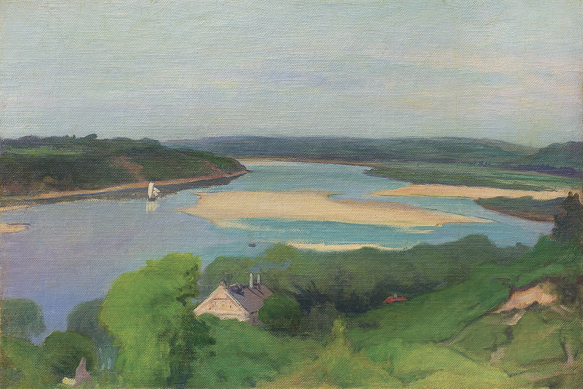 Dzięki życzliwości jednego z naszych Klientów, już po oddaniu katalogu do druku, ustalono ostatecznie, że obraz przedstawia Wisłę pod Kazimierzem, a powstał prawdopodobnie w 1908 lub 1909 roku, podczas pobytu Ślewińskiego w Kazimierzu Dolnym na plenerze. Nasz P.T. Konsultant określił nawet miejsce, z którego obraz mógł być malowany. To teren za Basztą, gdzie znajdowały się pensjonaty, zamieszkałe przez studentów Ślewińskiego. Widoczny na obrazie dach budynku z wysokimi kominami jest dachem starego spichlerza, w którym wówczas mieścił browar, a obecnie hotel. Na przeciwnym brzegu rzeki leży wieś Nasiłów. Ten pejzaż rozpoznać można wyraźnie na - załączonej, przesłanej nam - starej pocztówce.