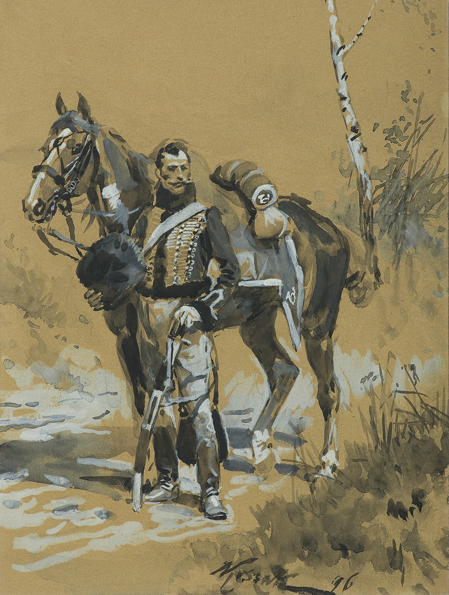 Wojciech Kossak (Paryż 1856 - Kraków 1942 ) – powszechnie znany malarz, postrzegany przede wszystkim jako świetny batalista. Syn i uczeń Juliusza Kossaka kształcił się w krakowskiej Szkole Sztuk Pięknych, w Akademii monachijskiej oraz w Paryżu. W latach 1895-1902 przebywał głównie w Berlinie, pracując dla cesarza Wilhelma II. Wiele podróżował, m.in. do Hiszpanii i Egiptu, gdzie wykonywał szkice do zamierzonych panoram. W późniejszych latach kilkakrotnie wyjeżdżał do Stanów Zjednoczonych wykonując zamówienia portretowe. W 1913 był mianowany profesorem warszawskiej Szkoły Sztuk Pięknych. W latach I wojny światowej pełnił służbę wojskową. Był współautorem panoram: „Racławice” (1893-1894), „Berezyna” (1895-1896), „Bitwa pod piramidami” (1901) oraz szkiców do niezrealizowanej „Somosierry” (1900). Z temperamentem i swobodą tworzył szeroko malowane, dynamiczne sceny batalistyczne, historyczne, rodzajowe oraz liczne portrety. Z upodobaniem malował konie. Jego obrazy, gloryfikujące dawne i współczesne artyście polskie wojsko i bohaterstwo żołnierzy, trafiały do patriotycznych uczuć odbiorców i cieszyły się ogromna popularnością.