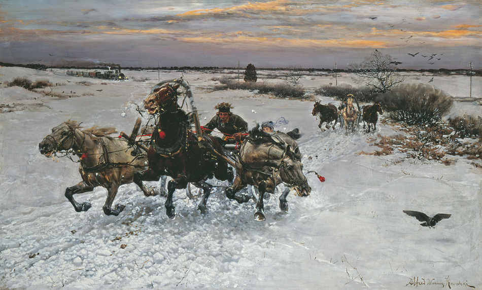 Alfred Wierusz-Kowalski (Suwałki 1849 – Monachium 1915) - jeden z najwybitniejszych polskich malarzy tzw. szkoły monachijskiej był, obok Józefa Brandta i Władysława Czachórskiego, także najpopularniejszym z polskich artystów osiadłych i stale działających w Monachium. Zamieszkał tam w roku 1873, już po studiach w Warszawie i w Dreźnie. Przez rok uczył się jeszcze w monachijskiej Akademii Sztuk Pięknych pod kierunkiem Alexandra Wagnera, a następnie przeniósł się do prywatnej pracowni Brandta. Uznanie krytyki i publiczności zdobył wcześnie; jego obrazy, odznaczane medalami na wystawach były rozchwytywane przez kolekcjonerów i niemieckich handlarzy. W roku 1890 został honorowym profesorem Akademii monachijskiej. Malował sceny rodzajowe i rodzajowo-historyczne z motywami jeźdźców, rycerzy, myśliwych, koni, wilków i śniegów. Po podróży do Afryki w roku 1903 podejmował też tematy orientalne. W polskich zbiorach muzealnych znalazło się stosunkowo niewiele prac artysty – jego obrazy sprzedawane głównie na rynku niemieckim w większej liczbie trafiały do kolekcji prywatnych, głównie w Niemczech i Stanach Zjednoczonych. Obecne często pojawiają się i na polskim rynku sztuki, zawsze budząc zainteresowanie kolekcjonerów.