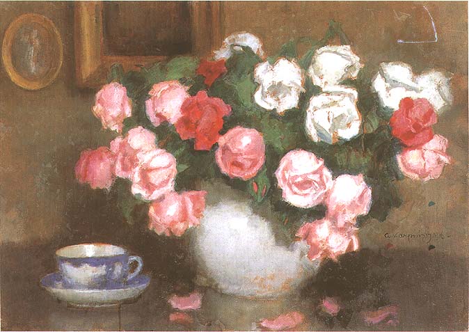 Alfons Karpiński (Rozwadów, dziś dzielnica Stalowej Woli 1875 - Kraków 1961) w latach 1891-1899 studiował w krakowskiej Szkole Sztuk Pięknych pod kierunkiem Floriana Cynka, Izydora Jabłońskiego, Władysława Łuszczkiewicza i Leona Wyczółkowskiego, a następnie kształcił się jeszcze u Antona Ažbégo w Monachium (1903), u Kazimierza Pochwalskiego w Wiedniu, a od 1907 także w Paryżu. Podróżował do Włoch i Londynu. Stale mieszkał w Krakowie; związany z tamtejszym środowiskiem skupionym wokół „Zielonego Balonika” projektował dekoracje do przedstawień kabaretu. Należał do Tow. Artystów Polskich „Sztuka”, grupy „Zero”, był członkiem wiedeńskiego stowarzyszenia „Secesja” i krakowskiego TPSP. Uczestniczył w wielu wystawach w kraju i za granicą. W czasie I wojny światowej służył w armii austriackiej. Na bogatą twórczość artysty składają się wczesne sceny rodzajowe z podkrakowskiej wsi, pejzaże i portrety, wśród nich zwłaszcza portrety kobiece, które przyniosły mu szczególną popularność. Z czasem głównym – obok portretu – tematem jego obrazów stały się martwe natury z kwiatami, dekoracyjne kompozycje o stonowanej gamie barwnej. Artysta zajmował się także grafiką i ilustratorstwem.