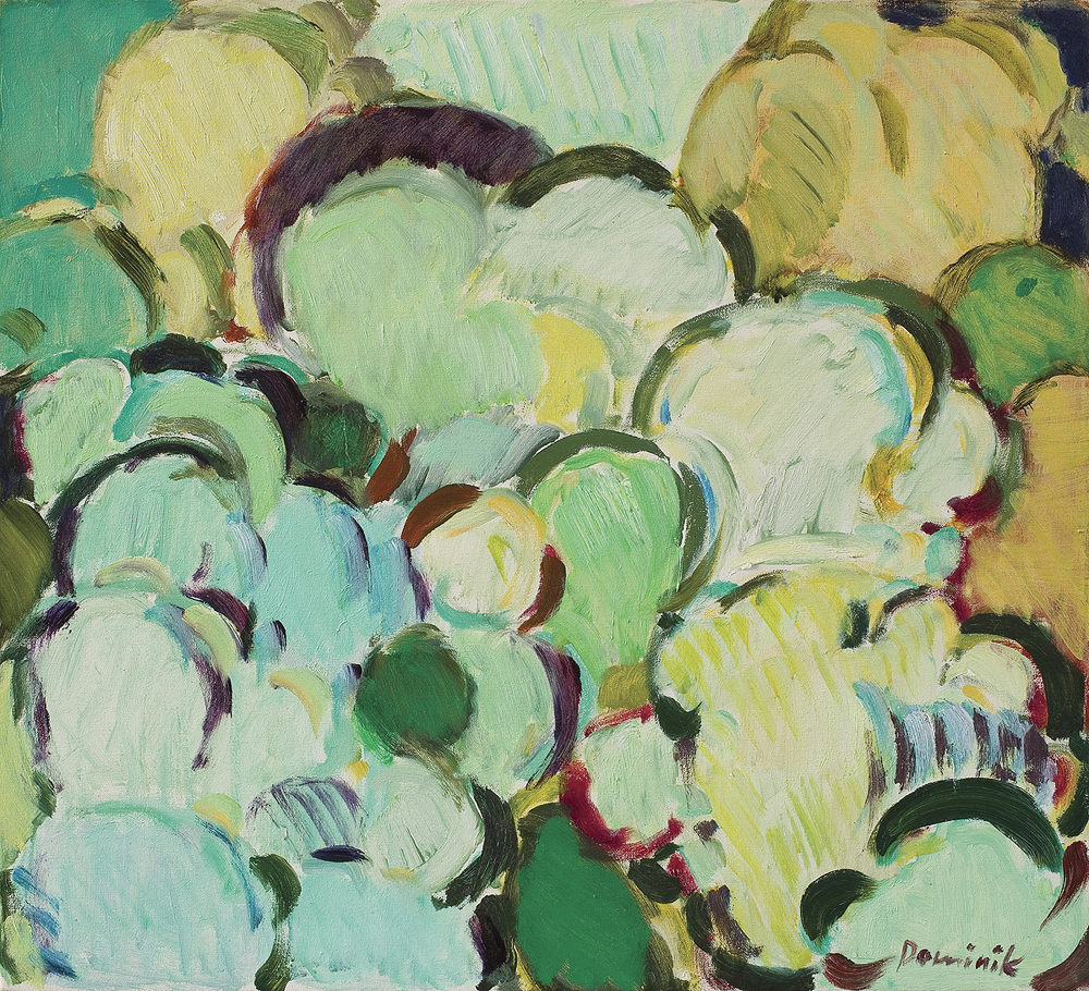 Tadeusz Dominik (Szymanów 14 I 1928 - Warszawa 20 V 2014) studiował na Wydziale Malarstwa ASP w Warszawie pod kierunkiem prof. J.Cybisa (1946-51, dyplom 1953). Od 1951 był pedagogiem na macierzystym Wydziale, początkowo jako asystent Cybisa. Od 1965 prowadził własną pracownię, w 1979 otrzymał tytuł profesora. W 1990 przeszedł na emeryturę. W czasie studiów oddziałały nań - za pośrednictwem osobowości i sztuki Cybisa - idee polskiego koloryzmu, które następnie twórczo i samodzielnie kontynuował. Początkowo tworzył obrazy figuratywne. Debiutował na słynnej wystawie w warszawskim Arsenale w 1955, gdzie zdobył nagrodę. W tym okresie obok malarstwa uprawiał drzeworyt, operujący szerokimi płaszczyznami bieli i czerni (drzeworyty wystawiał m.in. na Biennale w Wenecji w 1956). W drugiej poł. lat 50. zaczął malować obrazy abstrakcyjne, początkowo utrzymane w ekspresyjnej i spontanicznej stylistyce malarstwa informel. W latach 60. wzbogacił swe prace o efekty fakturowe. Niezmienną inspiracją była dla malarza natura, bogactwo i kolorystyka jej form. Pozostał jej wierny do dziś, poddając zmianom sam sposób malowania. Stopniowo rozjaśniał i wygładzał swe kompozycje, wprowadzając efekty dekoracyjne, jak rytmiczne powtórzenia form czy rodzaj malowanych „rastrów“, regularnie znaczących fragmenty kompozycji. Wśród wielu nagród otrzymał m.in. laur „Złotego Grona“ w Zielonej Górze w 1963, Grand Prix Festiwalu Polskiego Malarstwa Współczesnego w Szczecinie w 1968, nagrodę im. George’a Rowney’a w Londynie w 1973 i Nagrodę im. Jana Cybisa w Warszawie w 1973. Równolegle z malarstwem zajmował się gobelinem, ceramiką, również grafiką komputerową.