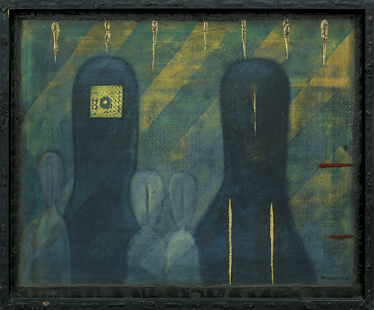 Henryk Musiałowicz (Gniezno 5 I 1914 - Warszawa 24 II 2015) od 1930 uczył się w Państwowej Szkole Sztuk Zdobniczych i Przemysłu Artystycznego w Poznaniu. W 1936 uzyskał absolutorium na Wydziale Malarstwa Dekoracyjnego i Witrażownictwa. W 1937 podjął studia malarskie w warszawskiej ASP pod kierunkiem Felicjana Kowarskiego i Leonarda Pękalskiego (dyplom pod kierunkiem tego pierwszego uzyskał w 1947). Lata okupacji spędził w Warszawie, kontynuując twórczość artystyczną (wykonywał w tym czasie m.in. ekslibrisy). Współpracował z Departamentem Informacji Delegatury Rządu na Kraj. Od 1940 związany był z grupą absolwentów warszawskiej uczelni, działającą w latach okupacji w tzw. Bacciarellówce na terenie Zamku Królewskiego, a po wojnie znaną jako grupa „Warszawa“. W sztuce Musiałowicza, zwłaszcza bezpośrednio po wojnie, silnie zaznaczyły się wątki związane z martyrologią, tragedią Powstania Warszawskiego, zburzeniem Warszawy, której ruiny upamiętnił w cyklu rysunków z 1945-1946. Poszukując formy odpowiedniej dla przeżyć wojennych, znalazł ją w sztuce Holendrów, zwłaszcza Rembrandta, którego twórczość poznał podczas podróży w 1956. Odtąd na stałe zdominował jego malarstwo ciemny koloryt, uspokojona, niekiedy hieratyczna kompozycja form zaledwie sugerujących figury ludzkie, bogata faktura i połyskliwość powierzchni. Z czasem artysta zaczął konstruować formy przestrzenne z drewna, jak zwykle pokrytego bogatą warstwą malarską, w wydłużonych stojących kształtach. Musiałowicz do 1983 aktywnie działał w ZPAP. Był członkiem międzynarodowych organizacji artystycznych, w tym kilku włoskich, jak Accademia Tibertina w Rzymie (od 1965), Accademia Italiana delle Arti e del Lavoro w Parmie (od 1979), Accademia Europea, Calvatone (od 1985). W 2002 wielką retrospektywę jego twórczości zorganizowało Muzeum Narodowe w Poznaniu.