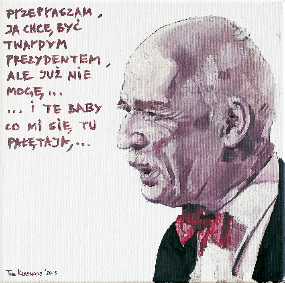 na odwr. na płótnie: „Janusz Korwin-Mikke | / z cyklu „Casting na | prezydenta“ | The Krasnals ‘2015 | Whielki Krasnal