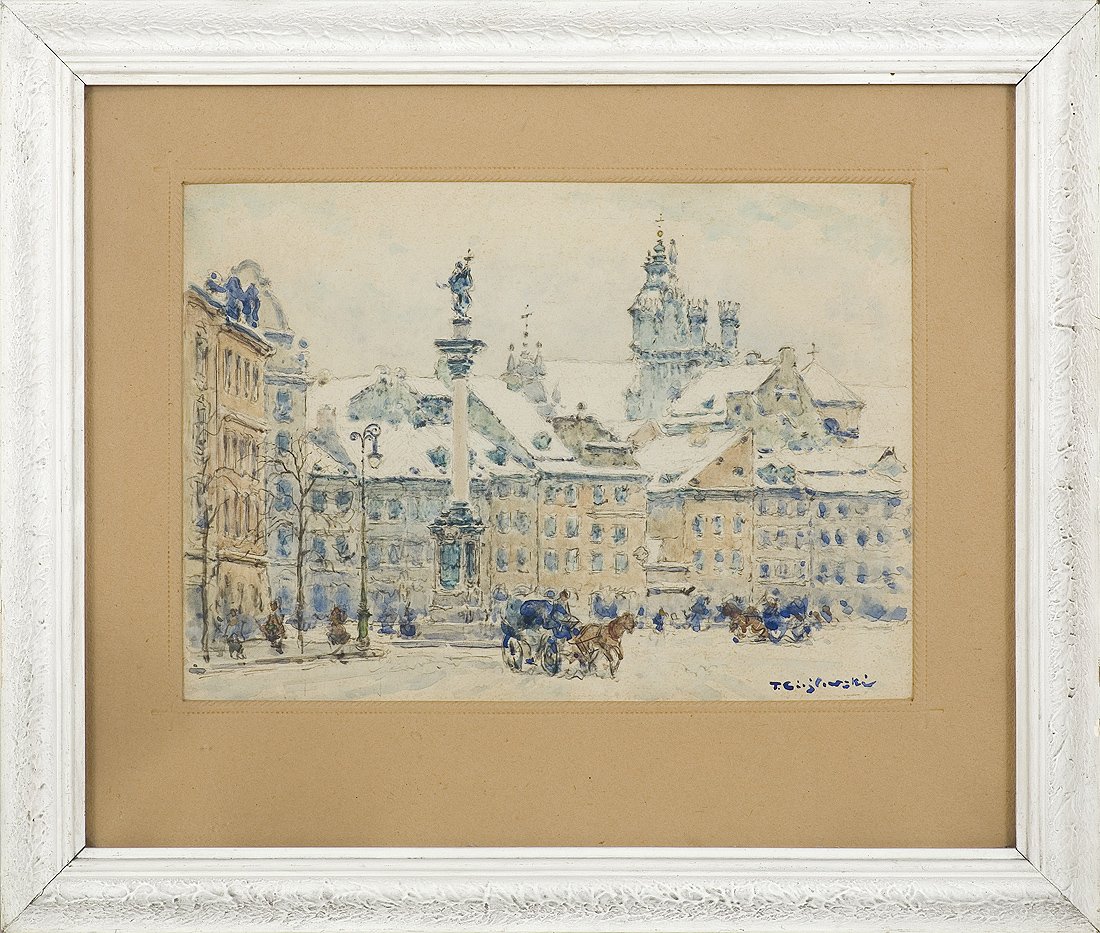 Tadeusz Cieślewski (Warszawa 1870 – Warszawa 1956) - ojciec grafika Tadeusza Cieślewskiego - studia artystyczne rozpoczął w warszawskiej Szkole Rysunkowej pod kierunkiem W. Gersona i J. Kauzika. W latach 1895-1896 kształcił się w Paryżu w Académie Vitti oraz u E. Aman-Jeana i R. Collina. W 1900 podróżował do Włoch i krótko studiował w Akademii rzymskiej. Stale mieszkał w Warszawie, aktywnie uczestnicząc w życiu artystycznym miasta. Debiutował na wystawie w warszawskiej Zachęcie w roku 1897; w 1898 otrzymał srebrny medal w konkursie na serię pocztówek warszawskich. Od 1906 był członkiem TZSP kilkakrotnie pełniąc funkcję wiceprezesa tego Towarzystwa. W 1929 otrzymał srebrny medal TZSP, w roku 1935 wyróżniono go dyplomem honorowym. Był współzałożycielem stowarzyszenia Sztuka i Rzemiosło (1904), należał do ugrupowania Pro Arte. Dużo wystawiał; przede wszystkim w Warszawie – w Zachęcie oraz, m.in. w Salonach Richlinga, Garlińskiego, Salonie Sztuki. Brał udział w wystawach sztuki polskiej za granicę – w 1924 w Moskwie, w 1936 na XX Biennale w Wenecji, w 1939 w Nowym Jorku. W czasie powstania warszawskiego utracił większość swego dorobku artystycznego. Kilka lat powojennych spędził w Piotrkowie, ale w 1948 wrócił do Warszawy. Był przede wszystkim malarzem architektury, szczególnie chętnie malował widoki ulic i placów Warszawy. Rzadziej tworzył pejzaże, martwe natury, portrety i kompozycje figuralne. Jego ulubioną techniką była akwarela, ale malował także olejno i pastelami. Dwukrotnie – w 1928 i 1951 – otrzymał nagrodę miasta Warszawy; odznaczony był także Złotym Krzyżem Zasługi oraz Krzyżem Oficerskim i Komandorskim orderu Odrodzenia Polski.