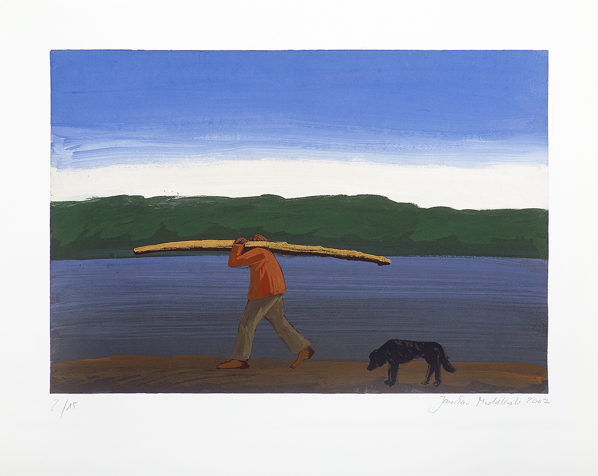 Jarosław Modzelewski (Warszawa 1955, mieszka w Warszawie) studiował malarstwo w ASP w Warszawie w latach 1975-1980, uzyskując dyplom w pracowni Stefana Gierowskiego. Od 1982 pracuje jako pedagog na macierzystym wydziale. W 1982 był współzałożycielem „Gruppy”, najważniejszego ugrupowania nurtu nowej ekspresji lat 80., działającego do 1992. W latach 1991-1996 wspólnie z Markiem Sobczykiem prowadził prywatną Szkołę Sztuki w Warszawie. Od wielu lat współpracuje z Galerią Zderzak w Krakowie. W początkowym okresie twórczości skłaniał się ku abstrakcji, wykorzystywał uproszczone znaki i emblematy oraz sylwetki odbite z szablonu. W 1985 namalował cykl oparty na ilustracjach do podręczników języka rosyjskiego, obrazujący proste czynności, których czasownikowe określenia stanowią tytuły prac. W 1986-1989 powstawały obrazy utrzymane w konwencji realistycznej, jednak zarazem o surrealnej atmosferze uzyskiwanej różnymi metodami, np. przez dublowanie figur, ukazywanie postaci w sytuacji niepewności czy zagrożenia, zabiegi z przestrzenią. W grupie obrazów z 1988 artysta rezygnuje z postaci ludzkiej na rzecz wyjątkowego nasycenia emocją samej przestrzeni pejzaży i wnętrz. Około 1990 wraca do kompozycji akcentujących czynności wykonywane przez postaci, które często umieszczone są w pustej, zaledwie zasugerowanej, acz dominującej przestrzeni. Odrealnienia i monumentalności dodaje tym obrazom płaskie i rozległe kładzenie koloru.