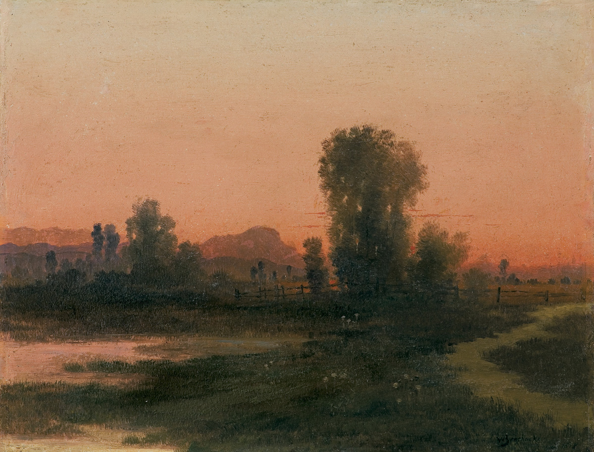 Walery Brochocki (Włocławek 1847 - Warszawa 1923) -malarz, autor pejzaży i widoków miejskich. Studia artystyczne rozpoczęte w warszawskiej Klasie Rysunkowej u Ch. Breslauera kontynuował od 1869 r. w Akademii monachijskiej pod kierunkiem A. Liera i H. An-schütza. W Monachim pozostał na dłużej, miał wspólną pracownię z A. Kotsisem i Z. Sidorowiczem, uczestniczył w tamtejszych wystawach. Jego obrazy cieszyły się powodzeniem, zwłaszcza gdy na Powszechnej Wystawie w Wiedniu w 1873 r. obraz artysty odznaczono medalem. W 1877 r. wyjechał do Paryża, gdzie malował, wykazując wpływy barbizończyków, krajobrazy z okolic Fontaienbleau. W 1878 r. jeździł do Algieru, by malować panoramę na zlecenie francuskiego rządu. W 1888 r. na stałe osiadł w Warszawie, skąd jeszcze wielokrotnie wyjeżdżał na Litwę, Podole i do Besarabii.