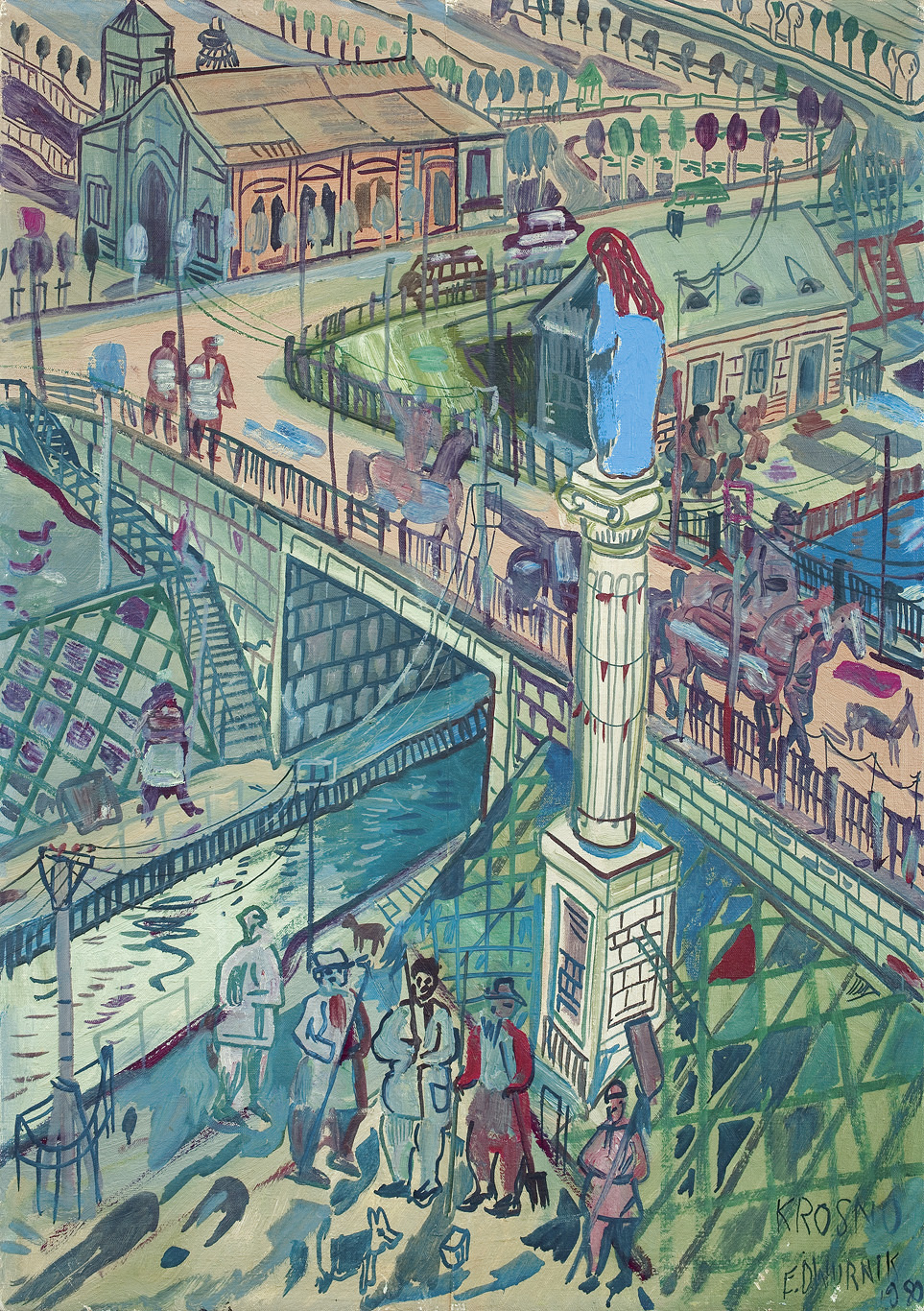 Edward Dwurnik (Radzymin 19 IV 1943 - Warszawa 28 X 2018) studiował malarstwo w ASP w Warszawie (1963-1970), jednak jako swego „mistrza“ wymienia Nikifora. Jego to prace, zobaczone po raz pierwszy w 1965, zainspirowały ówczesnego studenta III roku do narysowania pierwszych prac z cyklu „Podróże autostopem“, które kontynuował w nastepnych latach. W 1972-1978 powstawał cykl „Sportowcy“, w którym portretowane były, dodajmy - kąśliwie, typowe postaci z lat 70. Równolegle od 1975 powstawał cykl „Robotnicy“, który kulminował w okresie „Solidarności“ 1980-1981. Za prace z tego cyklu Dwurnik otrzymał w 1981 Nagrodę Krytyki Artystycznej im. Cypriana Kamila Norwida, natomiast za obrazy z cyklu „Warszawa“ (1981), proroczo zapowiadające stan wojenny - Nagrodę Kulturalną „Solidarności“ podziemnej w 1983. W latach 80. malarstwo Dwurnika przybrało wyraz ekspresyjny i dramatyczny. Powstające w tej dekadzie obrazy miały niejednokrotnie wymowę polityczną, przybierały też kostium historyczny, tak czy inaczej odnoszący się do współczesnych spraw i realiów. Cykl „Droga na Wschód“ (1989-91) upamiętniał ofiary stalinizmu, natomiast cykl „Od Grudnia do Czerwca“ (1990-94) - ofiary stanu wojennego. Zarówno ideowe, jak i czysto malarskie walory tych prac przyniosły artyście ogromne uznanie, zarówno w kraju jak i za granicą. Jego wyrazem była prestiżowa nagroda Fundacji Coutts & Co w Zurychu (1992). W latach 90. powstają cykle będące kontynuacją „Podróży autostopem“: „Niebieskie miasta“ (od 1993) i „Diagonale“ (od 1996), jak również kompozycje nowego typu, jak widoki morskie (cykl „Błękitne“, 1992-93) czy cykl „Wyliczanka“ (1996-99). Artysta wiele wystawia, miał ok. 100 wystaw indywidualnych w Polsce i za granicą, brał też udział w licznych wystawach i festiwalach krajowych i międzynarodowych, m.in.: X Biennale Sztuki Współczesnej, Menton 1974, Documenta 7, Kassel 1982, 5th Biennale, Sydney 1985, XIX Biennale Sztuki, Sao Paulo 1987; Olimpiada Sztuki, Seul 1988. Równolegle z malarstwem uprawiał rysunek, collage, grafikę warsztatową (litografia, techniki metalowe, kserografia, stemple) i użytkową (ilustracja, plakaty do własnych wystaw indywidualnych).