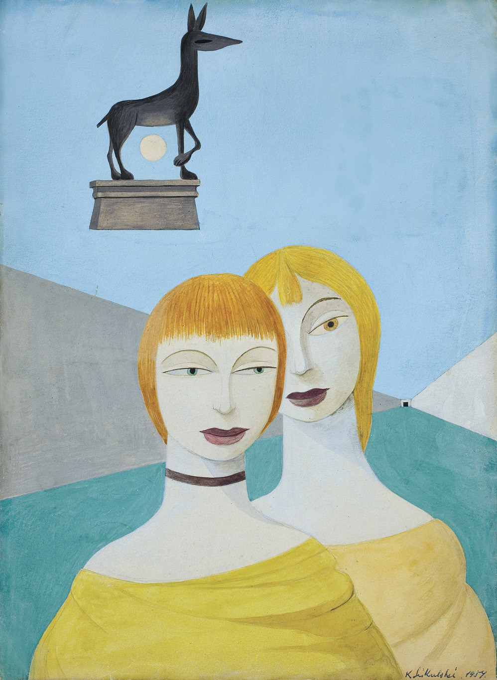 Kazimierz Mikulski (Kraków 1918 - Kraków 1998) rozpoczął studia malarskie przed II wojną światową w ASP w Krakowie, kontynuował je w latach 1939-1940 pod kierunkiem prof. Fryderyka Pautscha w Kunstgewerbeschule, powstałej za okupacji w miejsce Akademii. Po wojnie ukończył dwuletnie studia aktorskie w Studio Dramatycznym przy Starym Teatrze w Krakowie i do 1948 pracował jako aktor. Jednocześnie w 1945 ukończył Warsztat Filmowy Młodych. W latach 1948-1979 był kierownikiem plastycznym i scenografem Teatru Groteska w Krakowie, dla którego projektował lalki, kostiumy, dekoracje itp. Równolegle cały czas zajmował się malarstwem i działalnością w kręgu Tadeusza Kantora, zrazu jako członek Gru-py Młodych Plastyków, a od 1957 w Grupie Krakowskiej, której był współzałożycielem i prezesem w latach 1965-1967. Był też członkiem zespołu teatru Cricot 2, grał m.in. w spektaklach Kurka wodna, Nadobnisie i koczkodany, Umarła klasa oraz we własnej sztuce Cyrk. W swych obrazach z drugiej poł. lat 40. artysta przedstawiał lekkie, linearne formy unoszące się w pustych przestrzeniach. Było to malarstwo zarazem surrealistyczne i abstrakcyjne. Lecz już ok. 1950 zaczął malować w charaktery-styczny dlań sposób - odrzucając abstrakcję, prezentował niezliczone warianty i układy kilku ulubionych motywów (głowa lub postać kobiety-lalki, koty, motyle).