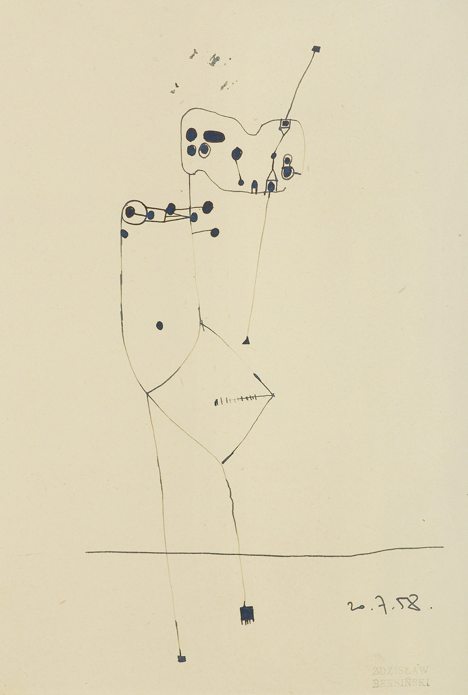 Zdzisław Beksiński (Sanok 24 II 1929 - Warszawa 21 II 2005) studiował w latach 1947-1952 na Wydziale Architektury Politechniki Krakowskiej. Był artystą samoukiem, który osiągnął niekwestionowaną pozycję w polskiej sztuce współczesnej, potwierdzoną obecnością jego prac na prestiżowych wystawach i w kolekcjach muzealnych. Początkowo zajmował się fotografią, którą interesował się od lat studenckich, po 1956 zyskując uznanie jako twórca fotogramów o estetyce opartej o efekty fakturowe. W latach 1958-1962 tworzył abstrakcyjne obrazy-reliefy o bogatej fakturze, głównie metalowe, będące odmianą malarstwa materii. Pod koniec tego okresu powstawały ażurowe formy o kształtach figur i pełnoplastyczne rzeźby w metalu. Kolejnym etapem jego twórczości były lata 1962-1974, kiedy poświęcał się głównie rysunkowi. W latach 60. rysował piórkiem i tuszem figuralne kompozycje odznaczające się karykaturalną deformacją postaci. Od końca lat 60. tworzył rysunki węglem i kredkami, będące monochromatyczną odmianą jego równoległej twórczości malarskiej. Od 1974 zajmował się niemal niepodzielnie malarstwem. Jego charakterystyczny styl bazował na perfekcji technicznej, której towarzyszyła niezwykłość wizji. Malował świat po katastrofie, naznaczony piętnem śmierci i rozpadu. Jego obrazy zaludniają postaci i stwory o ludzkich wprawdzie bądź zwierzęcych kształtach, lecz o cechach fantomów, automatów lub rozpadających się trucheł. Artysta nie nadawał swym obrazom i rysunkom tytułów (poza porządkującymi symbolami), akcentując w ten sposób swój brak zainteresowania dla literackiej strony przedstawień. Sam mówił, że malując całkowicie poddaje się wizji, „fotografuje“ ją. W ostatnich latach włączył do swego warsztatu artystycznego elektroniczne techniki generowania obrazu, które wykorzystywał do tworzenia komputerowych fotomontaży. Sztuka Beksińskiego, wielokrotnie wystawiana i omawiana, budzi skrajne emocje wśród znawców i publiczności.