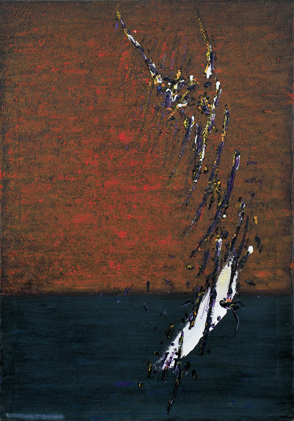 Rajmund Ziemski (Radom 1930 - Warszawa 2005) studiował malarstwo w latach 1949-1955 pod kierunkiem Artura Nachta-Samborskiego w Akademii Sztuk Pięknych w Warszawie. W roku dyplomowym wziął udział w Ogólnopolskiej Wystawie Młodej Plastyki w warszawskim Arsenale. Od 1958 wykłada w macierzystej uczelni, prowadząc w niej pracownię malarstwa, jedną z najchętniej wybieranych przez studentów jako pracownia dyplomowa. Prowadzący ją profesor jest również autorytetem artystycznym, jednym z najwybitniejszych przedstawicieli nurtu abstrakcji niegeometrycznej w polskim malarstwie powojennym. We wczesnym cyklu „Ptaki“ (1957-1958) operował kształtami bardzo uproszczonymi, malowanymi impasto na tłach zazwyczaj ciemnych, często o bogatej fakturze. Od początku lat 60. obrazy Ziemskiego przybrały charakterystyczny kształt wydłużonego prostokąta, w którego polu, niczym rozpięte, dramatyczne płachty, rozpościerały się aluzyjne pola koloru i faktury. Nosiły tytuły sugerujące związki z naturą, jednak górę w nich bierze zainteresowanie malarza kolorem i materią, traktowanymi autonomicznie, w oderwaniu od jakichkolwiek sugestii przedmiotowych. Te powróciły w znamiennym epizodzie z połowy lat 60., kiedy to artysta włączał w strukturę swych obrazów, często wtedy łączonych w Tryptyki, fotograficzne wizerunki twarzy ludzkich. Potem zarzucił ten proceder na rzecz dalszego rozwijania prób kolorystycznych, idących w kierunku ostrych kontrastów i niekiedy kakofonicznych zestawień. Pozostaje przy tym przy ustalonym jeszcze w latach 60. sposobie tytułowania i oznaczania prac (wielki, malowany do dziś cykl „Pejzaże“ z obrazami numerowanymi liczbą łamaną przez datę roczną).