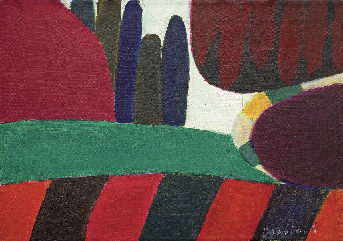 Tadeusz Dominik (Szymanów 14 I 1928 - Warszawa 20 V 2014) studiował na Wydziale Malarstwa ASP w Warszawie pod kierunkiem prof. J.Cybisa (1946-51, dyplom 1953). Od 1951 był pedagogiem na macierzystym Wydziale, początkowo jako asystent Cybisa. Od 1965 prowadził własną pracownię, w 1979 otrzymał tytuł profesora. W 1990 przeszedł na emeryturę. W czasie studiów oddziałały nań - za pośrednictwem osobowości i sztuki Cybisa - idee polskiego koloryzmu, które następnie twórczo i samodzielnie kontynuował. Początkowo tworzył obrazy figuratywne. Debiutował na słynnej wystawie w warszawskim Arsenale w 1955, gdzie zdobył nagrodę. W tym okresie obok malarstwa uprawiał drzeworyt, operujący szerokimi płaszczyznami bieli i czerni (drzeworyty wystawiał m.in. na Biennale w Wenecji w 1956). W drugiej poł. lat 50. zaczął malować obrazy abstrakcyjne, początkowo utrzymane w ekspresyjnej i spontanicznej stylistyce malarstwa informel. W latach 60. wzbogacił swe prace o efekty fakturowe. Niezmienną inspiracją była dla malarza natura, bogactwo i kolorystyka jej form. Pozostał jej wierny do dziś, poddając zmianom sam sposób malowania. Stopniowo rozjaśniał i wygładzał swe kompozycje, wprowadzając efekty dekoracyjne, jak rytmiczne powtórzenia form czy rodzaj malowanych „rastrów“, regularnie znaczących fragmenty kompozycji. Wśród wielu nagród otrzymał m.in. laur „Złotego Grona“ w Zielonej Górze w 1963, Grand Prix Festiwalu Polskiego Malarstwa Współczesnego w Szczecinie w 1968, nagrodę im. George’a Rowney’a w Londynie w 1973 i Nagrodę im. Jana Cybisa w Warszawie w 1973. Równolegle z malarstwem zajmował się gobelinem, ceramiką, również grafiką komputerową.