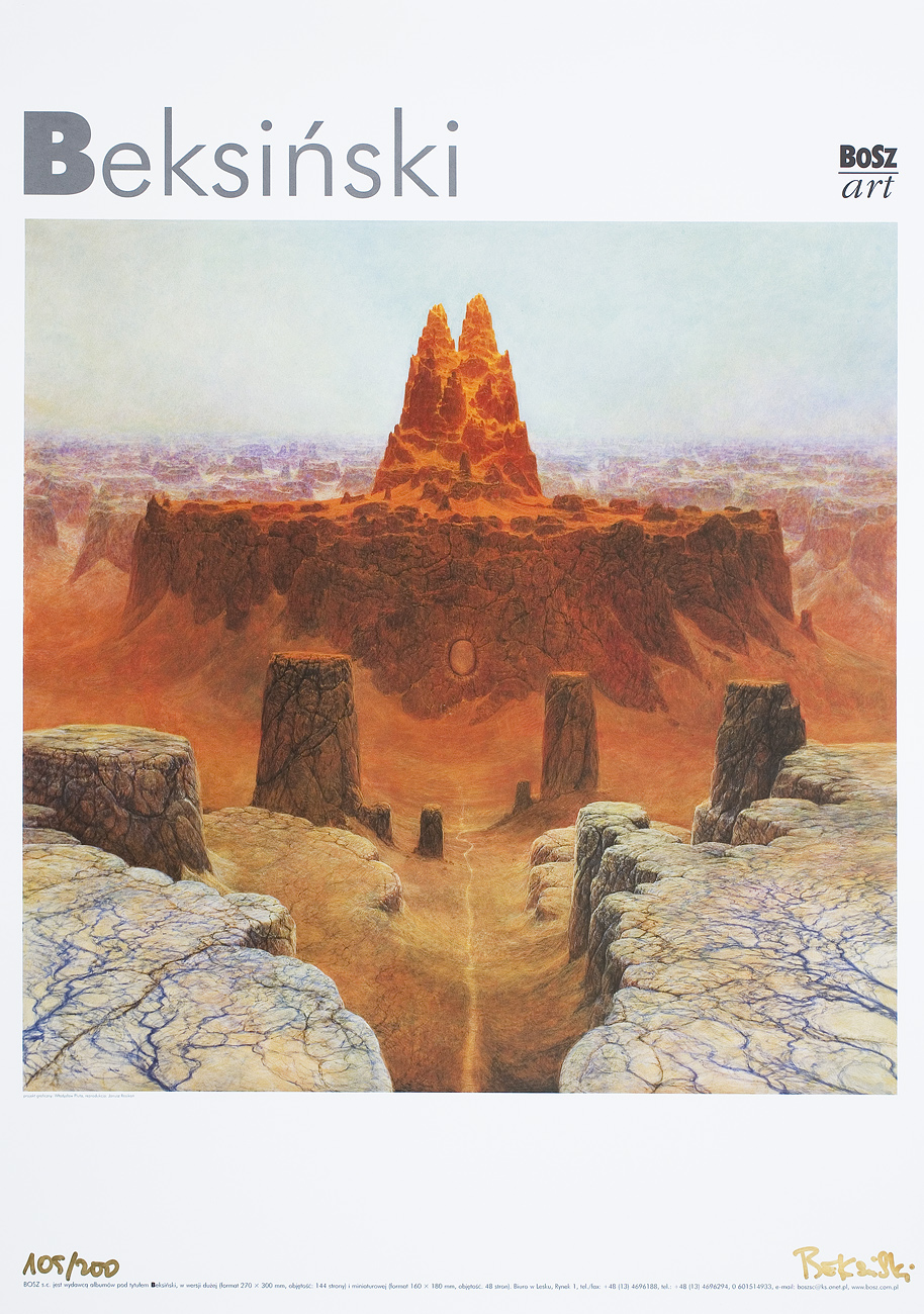 Zdzisław Beksiński (Sanok 24 II 1929 - Warszawa 21 II 2005) studiował w latach 1947-1952 na Wydziale Architektury Politechniki Krakowskiej. Był artystą samoukiem, który osiągnął niekwestionowaną pozycję w polskiej sztuce współczesnej, potwierdzoną obecnością jego prac na prestiżowych wystawach i w kolekcjach muzealnych. Początkowo zajmował się fotografią, którą interesował się od lat studenckich, po 1956 zyskując uznanie jako twórca fotogramów o estetyce opartej o efekty fakturowe. W latach 1958-1962 tworzył abstrakcyjne obrazy-reliefy o bogatej fakturze, głównie metalowe, będące odmianą malarstwa materii. Pod koniec tego okresu powstawały ażurowe formy o kształtach figur i pełnoplastyczne rzeźby w metalu. Kolejnym etapem jego twórczości były lata 1962-1974, kiedy poświęcał się głównie rysunkowi. W latach 60. rysował piórkiem i tuszem figuralne kompozycje odznaczające się karykaturalną deformacją postaci. Od końca lat 60. tworzył rysunki węglem i kredkami, będące monochromatyczną odmianą jego równoległej twórczości malarskiej. Od 1974 zajmował się niemal niepodzielnie malarstwem. Jego charakterystyczny styl bazował na perfekcji technicznej, której towarzyszyła niezwykłość wizji. Malował świat po katastrofie, naznaczony piętnem śmierci i rozpadu. Jego obrazy zaludniają postaci i stwory o ludzkich wprawdzie bądź zwierzęcych kształtach, lecz o cechach fantomów, automatów lub rozpadających się trucheł. Artysta nie nadawał swym obrazom i rysunkom tytułów (poza porządkującymi symbolami), akcentując w ten sposób swój brak zainteresowania dla literackiej strony przedstawień. Sam mówił, że malując całkowicie poddaje się wizji, „fotografuje“ ją. W ostatnich latach włączył do swego warsztatu artystycznego elektroniczne techniki generowania obrazu, które wykorzystywał do tworzenia komputerowych fotomontaży. Sztuka Beksińskiego, wielokrotnie wystawiana i omawiana, budzi skrajne emocje wśród znawców i publiczności.