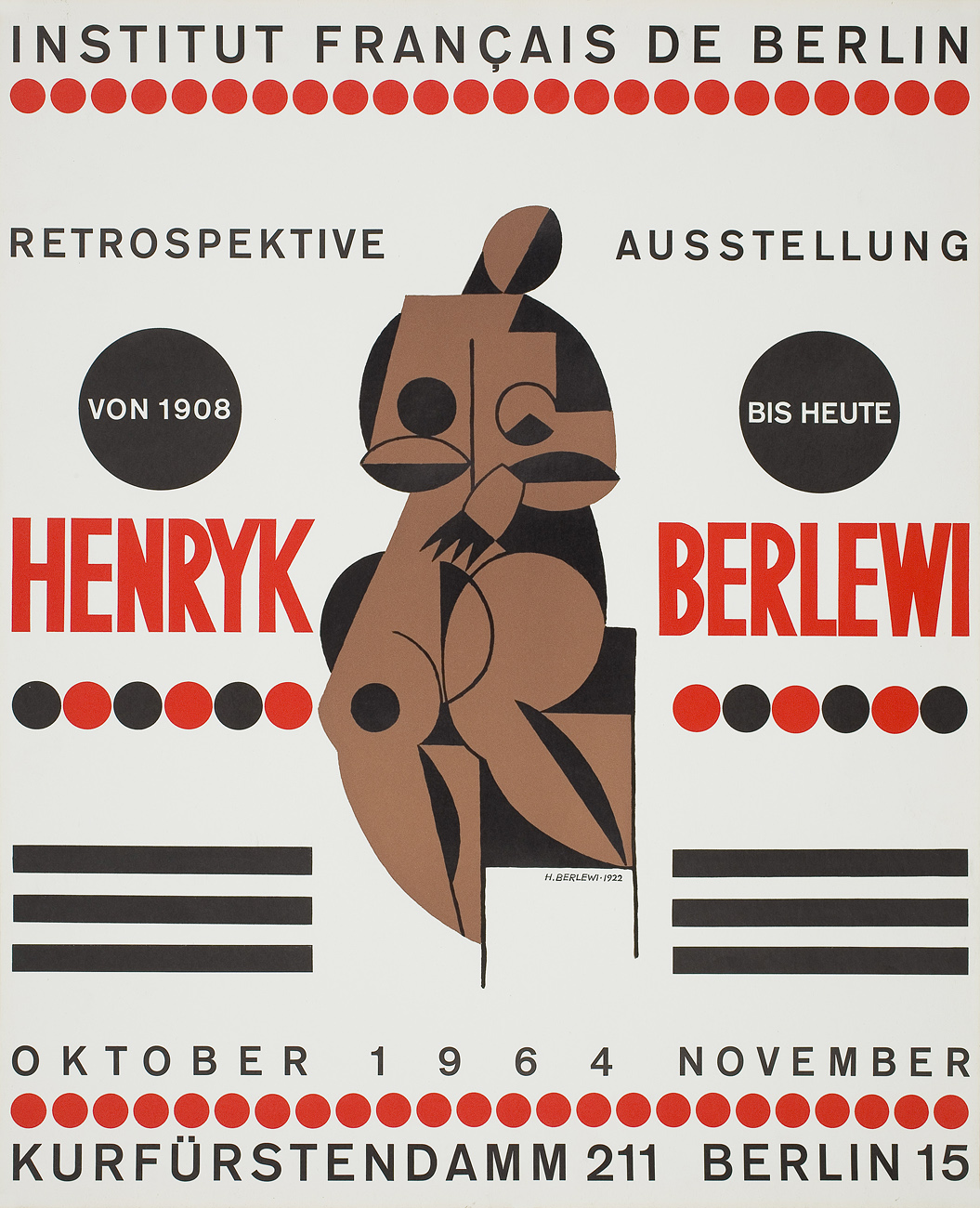 Henryk Berlewi (Warszawa 30 X 1894 - Paryż 2 VIII 1967) już jako uczeń gimnazjum uczęszczał na zajęcia w warszawskiej Szkole Sztuk Pięknych (1906-09). Następnie studiował w Académie des Beaux-Arts w Antwerpii (1909-10), w Ecole des Arts Décoratifs i Ecole des Beaux-Arts w Paryżu, by w 1913 powrócić do Warszawy i podjąć naukę w Szkole Rysunkowej pod kierunkiem Jana Kauzika (1913-15). W 1915-18 tworzył i wystawiał, m.in. w Zachęcie, portrety i kompozycje figuralne. Od 1918 datuje się zbliżenie Berlewiego z kręgami warszawskich futurystów i formistów. W jego pracach pojawia się deformacja i elementy ekspresjonizmu. Pod wpływem El Lissitzkiego, który w 1921 odwiedził Warszawę, zainteresował się ideą odnowy sztuki żydowskiej, podejmował wątki tematyczne związane z kulturą i życiem codziennym Żydów. W latach 1922-23 Berlewi przebywał w Berlinie, gdzie pod wpływem awangardowych kierunków i kontaktów z wybitnymi artystami radykalnie zmienił swą sztukę i wypracował teorię mechanofaktury, którą ogłosił drukiem w 1924 w Warszawie i Berlinie (w „Der Sturm“). Publikację artysta połączył z wystawami indywidualnymi w obu miastach. Wystawa warszawska miała miejsce w salonie samochodowym firmy Daimler-Benz, co współgrało z ideą mechanofaktury, zakładającą maksymalne zbliżenie sztuki i techniki, do czego prowadzić miało m.in. budowanie obrazu z powtarzalnych elementów geometrycznych. W 1924-26 Berlewi współtworzył wraz z innymi polskimi artystami grupę „Blok“. W 1926 powrócił do sztuki przedmiotowej, nie zrywając jednak z ruchem konstruktywistycznym. W 1928 wyjechał do Paryża, gdzie zdobył renomę jako portrecista. W latach II wojny światowej ukrywał się na południu Francji, w 1943-44 współpracował w Nicei z ruchem oporu. Po wojnie kontynuował malarstwo figuratywne aż do 1957, kiedy to pod wpływem nowych tendencji w sztuce, a także retrospektywnej wystawy konstruktywizmu w galerii Denise Renée, w której wziął udział, wrócił do abstrakcji. Nawiązał do teorii i praktyki mechanofaktury, traktując ją jako punkt wyjścia do stworzenia własnej wersji op-artu.