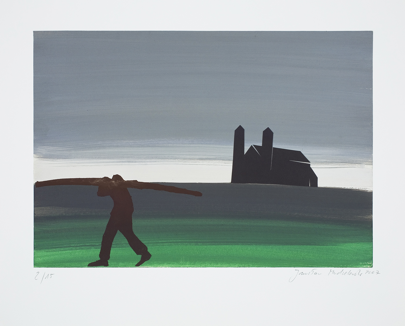 Jarosław Modzelewski (Warszawa 1955, mieszka w Warszawie) studiował malarstwo w ASP w Warszawie w latach 1975-1980, uzyskując dyplom w pracowni Stefana Gierowskiego. Od 1982 pracuje jako pedagog na macierzystym wydziale. W 1982 był współzałożycielem „Gruppy”, najważniejszego ugrupowania nurtu nowej ekspresji lat 80., działającego do 1992. W latach 1991-1996 wspólnie z Markiem Sobczykiem prowadził prywatną Szkołę Sztuki w Warszawie. Od wielu lat współpracuje z Galerią Zderzak w Krakowie. W początkowym okresie twórczości skłaniał się ku abstrakcji, wykorzystywał uproszczone znaki i emblematy oraz sylwetki odbite z szablonu. W 1985 namalował cykl oparty na ilustracjach do podręczników języka rosyjskiego, obrazujący proste czynności, których czasownikowe określenia stanowią tytuły prac. W 1986-1989 powstawały obrazy utrzymane w konwencji realistycznej, jednak zarazem o surrealnej atmosferze uzyskiwanej różnymi metodami, np. przez dublowanie figur, ukazywanie postaci w sytuacji niepewności czy zagrożenia, zabiegi z przestrzenią. W grupie obrazów z 1988 artysta rezygnuje z postaci ludzkiej na rzecz wyjątkowego nasycenia emocją samej przestrzeni pejzaży i wnętrz. Około 1990 wraca do kompozycji akcentujących czynności wykonywane przez postaci, które często umieszczone są w pustej, zaledwie zasugerowanej, acz dominującej przestrzeni. Odrealnienia i monumentalności dodaje tym obrazom płaskie i rozległe kładzenie koloru.
