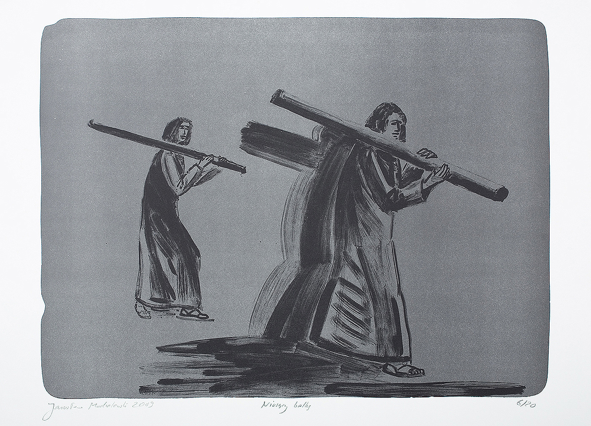 Jarosław Modzelewski (Warszawa 1955, mieszka w Warszawie) studiował malarstwo w ASP w Warszawie w latach 1975-1980, uzyskując dyplom w pracowni Stefana Gierowskiego. Od 1982 pracuje jako pedagog na macierzystym wydziale. W 1982 był współzałożycielem „Gruppy”, najważniejszego ugrupowania nurtu nowej ekspresji lat 80., działającego do 1992. W latach 1991-1996 wspólnie z Markiem Sobczykiem prowadził prywatną Szkołę Sztuki w Warszawie. Od wielu lat współpracuje z Galerią Zderzak w Krakowie. W początkowym okresie twórczości skłaniał się ku abstrakcji, wykorzystywał uproszczone znaki i emblematy oraz sylwetki odbite z szablonu. W 1985 namalował cykl oparty na ilustracjach do podręczników języka rosyjskiego, obrazujący proste czynności, których czasownikowe określenia stanowią tytuły prac. W 1986-1989 powstawały obrazy utrzymane w konwencji realistycznej, jednak zarazem o surrealnej atmosferze uzyskiwanej różnymi metodami, np. przez dublowanie figur, ukazywanie postaci w sytuacji niepewności czy zagrożenia, zabiegi z przestrzenią. W grupie obrazów z 1988 artysta rezygnuje z postaci ludzkiej na rzecz wyjątkowego nasycenia emocją samej przestrzeni pejzaży i wnętrz. Około 1990 wraca do kompozycji akcentujących czynności wykonywane przez postaci, które często umieszczone są w pustej, zaledwie zasugerowanej, acz dominującej przestrzeni. Odrealnienia i monumentalności dodaje tym obrazom płaskie i rozległe kładzenie koloru.