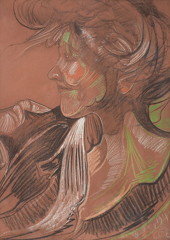 Witkacy, zaprzyjaźniony z Kazimierą Żuławską, portretował ją kilkakrotnie, zarówno w czasach zakopiańskich, jak i toruńskich. Prezentowany portret - oznaczony literami T.C. - jest najwcześniejszy, wedle ustaleń Ireny Jakimowicz powstał w roku 1919, a więc jeszcze przed utworzeniem Firmy Portretowej, co „oficjalnie“ nastąpiło w roku 1925. Jednak już wcześniej artysta rysował portrety, które czasem oznaczał literami T.C. - symbolem Czystej Formy. Rzadziej stosował też inne oznaczenia - T.A., T.B., T.D., T.E. - pełne ich objaśnienia podał dopiero w Regulaminie Firmy Portretowej opublikowanym w 1925.