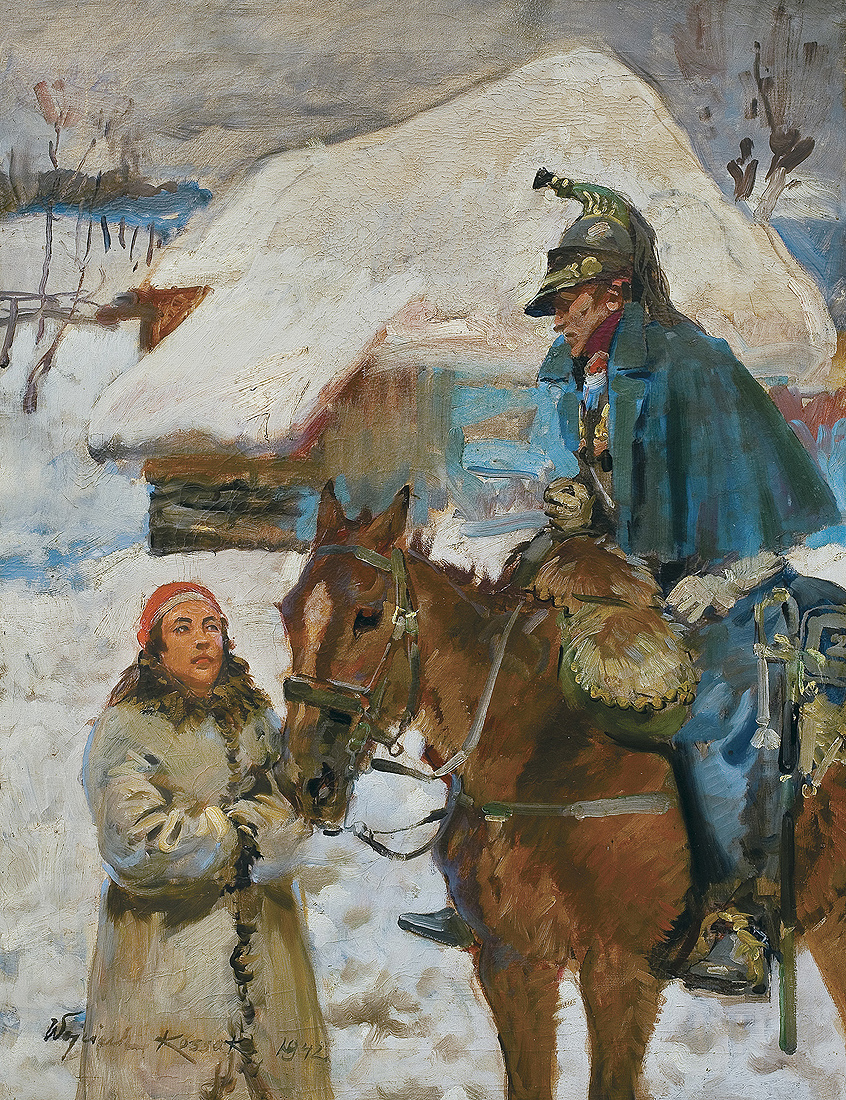 Wojciech Kossak (Paryż 1856 - Kraków 1942 ) – powszechnie znany malarz, postrzegany przede wszystkim jako świetny batalista. Syn i uczeń Juliusza Kossaka kształcił się w krakowskiej Szkole Sztuk Pięknych, w Akademii monachijskiej oraz w Paryżu. W latach 1895-1902 przebywał głównie w Berlinie, pracując dla cesarza Wilhelma II. Wiele podróżował, m.in. do Hiszpanii i Egiptu, gdzie wykonywał szkice do zamierzonych panoram. W późniejszych latach kilkakrotnie wyjeżdżał do Stanów Zjednoczonych wykonując zamówienia portretowe. W 1913 był mianowany profesorem warszawskiej Szkoły Sztuk Pięknych. W latach I wojny światowej pełnił służbę wojskową. Był współautorem panoram: „Racławice” (1893-1894), „Berezyna” (1895-1896), „Bitwa pod piramidami” (1901) oraz szkiców do niezrealizowanej „Somosierry” (1900). Z temperamentem i swobodą tworzył szeroko malowane, dynamiczne sceny batalistyczne, historyczne, rodzajowe oraz liczne portrety. Z upodobaniem malował konie. Jego obrazy, gloryfikujące dawne i współczesne artyście polskie wojsko i bohaterstwo żołnierzy, trafiały do patriotycznych uczuć odbiorców i cieszyły się ogromna popularnością.