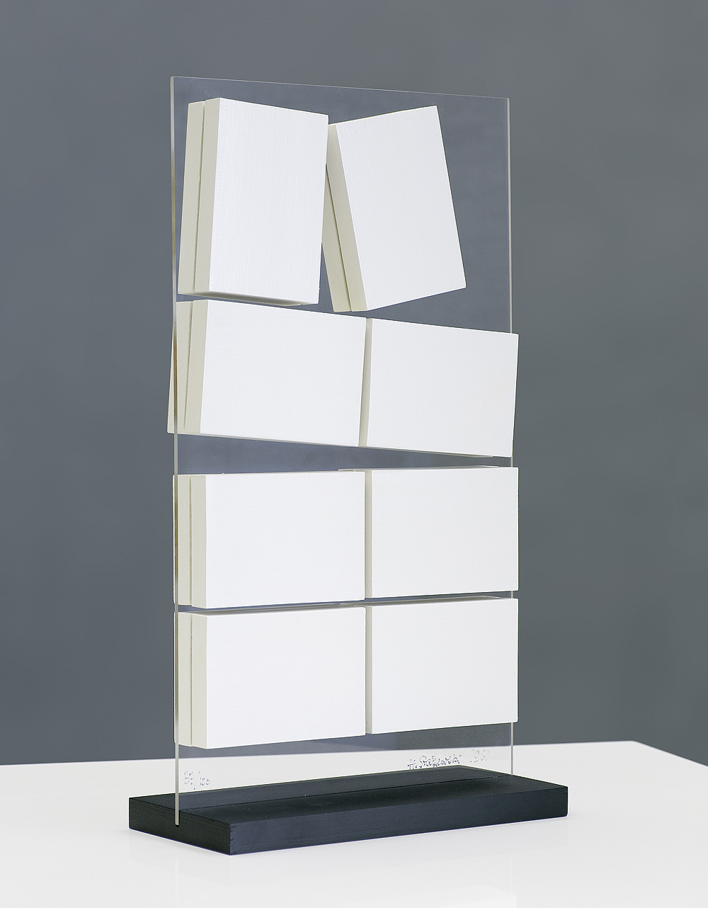 Henryk Stażewski (Warszawa 9 I 1894 - Warszawa 10 VI 1988) studiował w Szkole Sztuk Pięknych w Warszawie w latach 1913-1920. W początkach kariery malował martwe natury. Przejściowo wystawiał z ugrupowaniem „Formiści” (1922). Wziął też udział w Wystawie Nowej Sztuki w Wilnie w 1923. O tego czasu tworzył pod wpływem konstruktywizmu. Obok kompozycji malarskich trudnił się grafiką książkową, projektował wnętrza, sprzęty, a także scenografie – były to w większości prace teoretyczne i studyjne. Polskie i międzyna-rodowe ugrupowania awangardy, z którymi wystawiał i współpracował jako publicysta, to kolejno: „Blok” (1924-1926), „Praesens” (1926-1930), „Cercle et Carré” (1929-1931), „Abstraction-Création” (1931-1939), „a. r.” (1932-1939). Należał też do Koła Artystów Grafików Reklamowych (1933-1939). W 1930 był współorganizatorem zbiórki dzieł artystów międzynarodowej awangardy przeznaczonych dla muzeum łódzkiego (obecnie w Muzeum Sztuki w Łodzi). Po II wojnie mieszkał i działał w Warszawie. W latach 40. i 50. podejmował próby dostosowania się do postulatów sztuki figuratywnej. Z tego okresu pochodzą rysunkowe i malarskie kompozycje o tematyce pracy, budowy, a także projekty monumentalne. Po 1956, uznawany powszechnie za patrona polskiej awangardy, uprawiał już wyłącznie abstrakcję o konstruktywistycznym rodowodzie. Tworzył cykle prac, będących studiami płaszczyzn, linii, kolorów w różnych układach względem siebie. Przy pozorach chłodnej perfekcji umiał nasycić je emocją bezpośredniego dotknięcia, śladu ręki. Obok malarstwa i form pochodnych, jak collages, reliefy, multiple, tworzył formy przestrzenne i grafikę (autoryzował serigraficzne repliki swoich prac). Był laureatem wielu nagród i odznaczeń krajowych i zagranicznych, w tym Nagrody Herdera, Wiedeń 1972.