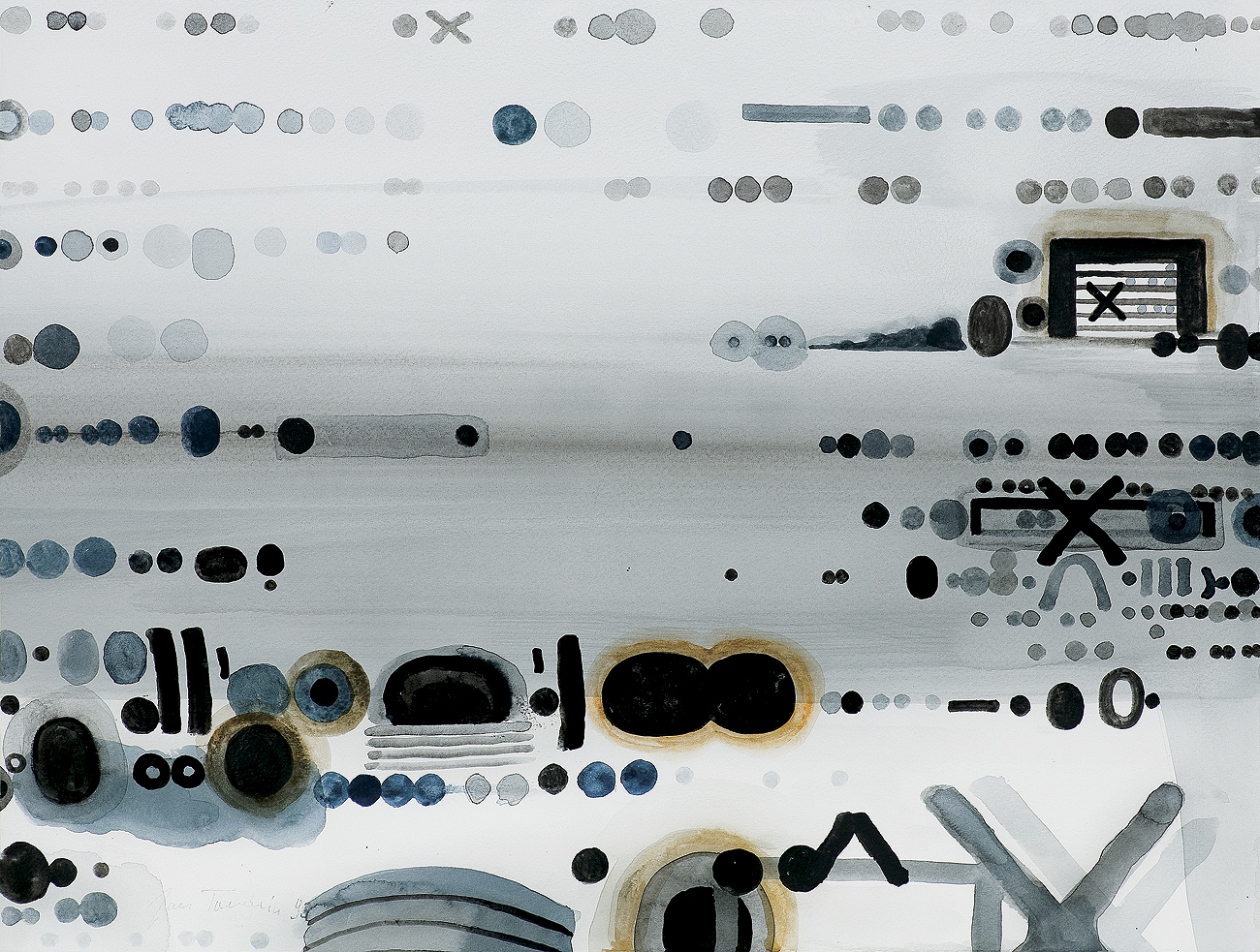 Jan Tarasin (Kalisz 11 IX 1926 - Warszawa 8 VIII 2009) studiował malarstwo w ASP w Krakowie pod kierunkiem prof. Zbigniewa Pronaszki (1946-1951). Jeszcze jako student zadebiutował na I Wystawie Sztuki Nowoczesnej w Krakowie w 1948/49. W połowie lat 50. stworzył cykle litografii: „Nowa Huta i jej mieszkańcy“, 1954, „Dom“, 1955). W pierwszym przeciwstawił się oficjalnemu optymizmowi, w drugim, operując symboliką martwej natury, zawarł treści egzystencjalne i odnoszące do niedawnego dramatu wojny. Po 1956 zaczął malować obrazy niefiguratywne. Układy wyodrębnionych elementów (określanych jako „przedmioty“) umieszczane były przez artystę na płaszczyźnie (cykl „Wnętrze“, 1957) ), lub w aluzyjnej przestrzeni (cykle „Uczta“, 1957, „Brzeg“, 1962-1964, „Przedmioty policzone“, od 1968, „Antykwariat“, 1968). Zasada ta utrzymuje się w jego malarstwie w następnych latach, różnice między okresami twórczości dotyczą sposobu opracowania „przedmiotów“ i ich usytuowania w przestrzeni obrazu lub wobec tła. Od lat 70. „przedmioty“ zmieniają się w graficzne, zwykle czarne znaki na jasnych tłach (cykl „Kolekcja“, od 1971). Tła z kolei bywają iluzyjnie przestrzenne, zróżnicowane walorowo, miękkie. W latach 90. artysta wrócił do kolorystycznego, bardziej malarskiego rozwiązywania zarówno znaków, jak i teł, często ciemnych lub przenikających się z „przedmiotami“ (cykl „Wylęgarnia przedmiotów“, 1992). Tarasin od 1962 jest członkiem „Grupy Krakowskiej“. W 1963-67 uczył na Wydziale Architektury Wnętrz krakowskiej ASP. W 1967 przeniósł się do Warszawy, w 1974 podjął pracę pedagogiczną na Wydziale Malarstwa ASP w Warszawie. W 1987-90 był rektorem tej uczelni. W 1976 otrzymał Nagrodę Krytyki Artystycznej im. Cypriana Kamila Norwida, w 1984 Nagrodę im. Jana Cybisa.; Nagroda na MB Sztuki w San Marino 1965. Równolegle z malarstwem zajmował się rysunkiem i grafiką - do lat 60. litografią, od 1974 serigrafią. W 1974-1981 wydał 8 autorskich „Zeszytów“ z serigrafiami i własnymi tekstami. W 1995 w Galerii Zachęta odbyła się wystawa artysty, której towarzyszył monograficzny katalog.