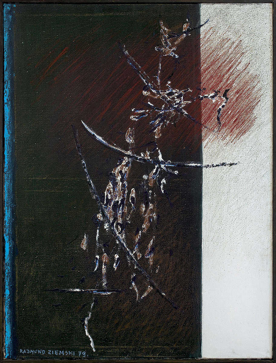 Rajmund Ziemski (Radom 1930 - Warszawa 2005) studiował malarstwo w latach 1949-1955 pod kierunkiem Artura Nachta-Samborskiego w Akademii Sztuk Pięknych w Warszawie. W roku dyplomowym wziął udział w Ogólnopolskiej Wystawie Młodej Plastyki w warszawskim Arsenale. Od 1958 wykłada w macierzystej uczelni, prowadząc w niej pracownię malarstwa, jedną z najchętniej wybieranych przez studentów jako pracownia dyplomowa. Prowadzący ją profesor jest również autorytetem artystycznym, jednym z najwybitniejszych przedstawicieli nurtu abstrakcji niegeometrycznej w polskim malarstwie powojennym. We wczesnym cyklu „Ptaki“ (1957-1958) operował kształtami bardzo uproszczonymi, malowanymi impasto na tłach zazwyczaj ciemnych, często o bogatej fakturze. Od początku lat 60. obrazy Ziemskiego przybrały charakterystyczny kształt wydłużonego prostokąta, w którego polu, niczym rozpięte, dramatyczne płachty, rozpościerały się aluzyjne pola koloru i faktury. Nosiły tytuły sugerujące związki z naturą, jednak górę w nich bierze zainteresowanie malarza kolorem i materią, traktowanymi autonomicznie, w oderwaniu od jakichkolwiek sugestii przedmiotowych. Te powróciły w znamiennym epizodzie z połowy lat 60., kiedy to artysta włączał w strukturę swych obrazów, często wtedy łączonych w Tryptyki, fotograficzne wizerunki twarzy ludzkich. Potem zarzucił ten proceder na rzecz dalszego rozwijania prób kolorystycznych, idących w kierunku ostrych kontrastów i niekiedy kakofonicznych zestawień. Pozostaje przy tym przy ustalonym jeszcze w latach 60. sposobie tytułowania i oznaczania prac (wielki, malowany do dziś cykl „Pejzaże“ z obrazami numerowanymi liczbą łamaną przez datę roczną).