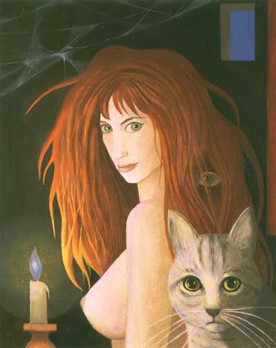Kazimierz Mikulski (Kraków 1918 - Kraków 1998) rozpoczął studia malarskie przed II wojną światową w ASP w Krakowie, kontynuował je w latach 1939-1940 pod kierunkiem prof. Fryderyka Pautscha w Kunstgewerbeschule, powstałej za okupacji w miejsce Akademii. Po wojnie ukończył dwuletnie studia aktorskie w Studio Dramatycznym przy Starym Teatrze w Krakowie i do 1948 pracował jako aktor. Jednocześnie w 1945 ukończył Warsztat Filmowy Młodych. W latach 1948-1979 był kierownikiem plastycznym i scenografem Teatru Groteska w Krakowie, dla którego projektował lalki, kostiumy, dekoracje itp. Równolegle cały czas zajmował się malarstwem i działalnością w kręgu Tadeusza Kantora, zrazu jako członek Gru-py Młodych Plastyków, a od 1957 w Grupie Krakowskiej, której był współzałożycielem i prezesem w latach 1965-1967. Był też członkiem zespołu teatru Cricot 2, grał m.in. w spektaklach Kurka wodna, Nadobnisie i koczkodany, Umarła klasa oraz we własnej sztuce Cyrk. W swych obrazach z drugiej poł. lat 40. artysta przedstawiał lekkie, linearne formy unoszące się w pustych przestrzeniach. Było to malarstwo zarazem surrealistyczne i abstrakcyjne. Lecz już ok. 1950 zaczął malować w charaktery-styczny dlań sposób - odrzucając abstrakcję, prezentował niezliczone warianty i układy kilku ulubionych motywów (głowa lub postać kobiety-lalki, koty, motyle).