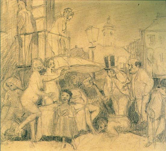 Bruno Schulz (Drohobycz 1892 – Drohobycz 1942) studiował na Wydziale Architektury Politechniki Lwowskiej (1913-1914) i malarstwo w ASP we Wiedniu (1914-1915). Całe życie spędził w Drohobyczu, gdzie pracował jako nauczyciel rysunku w Gimnazjum im. Władysława Jagiełły (1924-1941). Utrzymywał przyjaźnie głównie w środowisku literackim, m. in. z Witkacym, którego odwiedzał w Zakopanem (1930) i z Zofią Nałkowską, którą od 1933 wielokrotnie odwiedzał w Warszawie. W 1938 otrzymał Złoty Wawrzyn Polskiej Akademii Literatury. Obok literatury, która była główną dziedziną jego twórczości, uprawiał rysunek, grafikę (cliché verre – teka „Xięga Bałwochwalcza”, 1922) i ilustrację, przeważnie do własnych utworów. Zginął zastrzelony na ulicy w dniu eksterminacji drohobyckich Żydów.