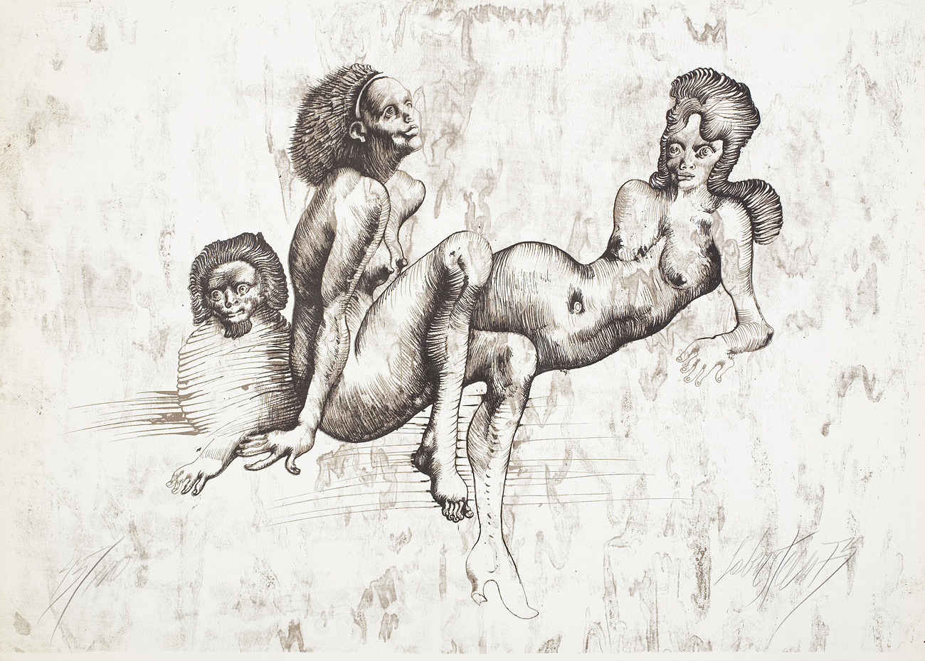 Jan Lebenstein (Brześć Litewski 1930 - Kraków 1999) w latach 1948-1954 studiował malarstwo w ASP w Warszawie pod kierunkiem prof. Eugeniusza Eibischa i Artura Nachta-Samborskiego. W 1955 wziął udział w wystawie w warszawskim Arsenale. Zaprzyjaźniony w czasie studiów z Mironem Białoszewskim, swą pierwszą wystawę indywidualną pokazał w 1956 w Teatrze na Tarczyńskiej. W 1959 zdobył Grand Prix de la Ville de Paris na I Biennale Młodych w Paryżu i w tym roku przeniósł się na stałe do Paryża. Po seriach "figur kreślonych" (na papierze milimetrowym) i "figur hieratycznych" z lat 1955-1958 maluje cykl "figur osiowych" (1958-1962), które wystawia w Paryżu i USA. Równolegle w 1960 zaczyna rysowane "karnety", rodzaj dziennika, który w przyszłości dostarczy motywów wykorzystanych w obrazach. W latach 1964-1965 maluje "Bestiarium", cykl fakturowych, archaizowanych stworów przypominających prehistoryczne wykopaliska. Bezpośrednio po nich wprowadza do swych obrazów postaci ludzkie i fantastyczne, odgrywające sceny ni to mitologiczne, ni to ze snu, często przesycone erotyką. W 1970 projektuje witraże dla Centre du Dialogue w Paryżu. W W 1971 otrzymuje obywatelstwo francuskie 1974 powstają gwasze inspirowane Folwarkiem zwierzęcym George'a Orwella. W latach 1976-1989 tworzy wyłącznie w technice gwaszu i pastelu, podejmując tematykę mitologiczną i zaczerpniętą z Biblii: cykle ilustracji do Księgi Hioba (wyd. 1979) i do Apokalipsy (wyd. 1986) w nowych przekładach Czesława Miłosza. W 1989 powraca do malarstwa olejnego (cykl "Pergamon"). Artysta otrzymał m. in. nagrodę Fundacji im. Alfreda Jurzykowskiego w 1976, Nagrodę Muzeum Archidiecezji Warszawskiej w 1985, Nagrodę im. Jana Cybisa w 1987.