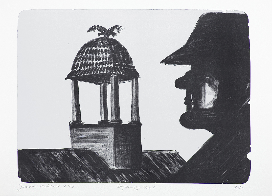 Jarosław Modzelewski (Warszawa 1955, mieszka w Warszawie) studiował malarstwo w ASP w Warszawie w latach 1975-1980, uzyskując dyplom w pracowni Stefana Gierowskiego. Od 1982 pracuje jako pedagog na macierzystym wydziale. W 1982 był współzałożycielem „Gruppy”, najważniejszego ugrupowania nurtu nowej ekspresji lat 80., działającego do 1992. W latach 1991-1996 wspólnie z Markiem Sobczykiem prowadził prywatną Szkołę Sztuki w Warszawie. Od wielu lat współpracuje z Galerią Zderzak w Krakowie. W początkowym okresie twórczości skłaniał się ku abstrakcji, wykorzystywał uproszczone znaki i emblematy oraz sylwetki odbite z szablonu. W 1985 namalował cykl oparty na ilustracjach do podręczników języka rosyjskiego, obrazujący proste czynności, których czasownikowe określenia stanowią tytuły prac. W 1986-1989 powstawały obrazy utrzymane w konwencji realistycznej, jednak zarazem o surrealnej atmosferze uzyskiwanej różnymi metodami, np. przez dublowanie figur, ukazywanie postaci w sytuacji niepewności czy zagrożenia, zabiegi z przestrzenią. W grupie obrazów z 1988 artysta rezygnuje z postaci ludzkiej na rzecz wyjątkowego nasycenia emocją samej przestrzeni pejzaży i wnętrz. Około 1990 wraca do kompozycji akcentujących czynności wykonywane przez postaci, które często umieszczone są w pustej, zaledwie zasugerowanej, acz dominującej przestrzeni. Odrealnienia i monumentalności dodaje tym obrazom płaskie i rozległe kładzenie koloru.